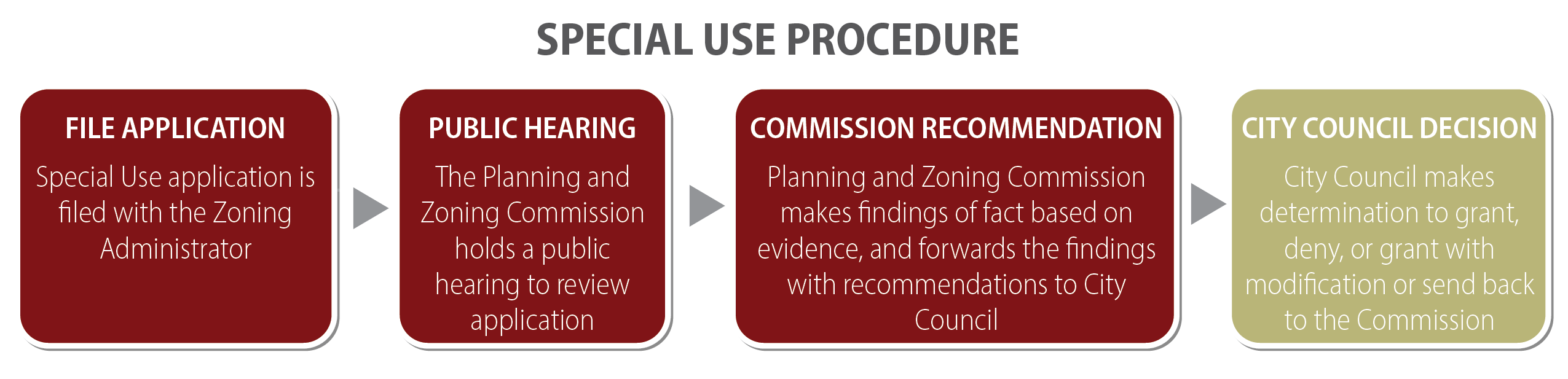 Decision of the city council. Within 45 days of the public hearing, the city council shall review the findings and recommendations of the planning and zoning commission. The city council may grant, deny, or grant with modification, the special use, or may refer the proposed special use back to the planning and zoning commission for further consideration. If the city council grants a special use, it shall adopt an ordinance authorizing such special use.