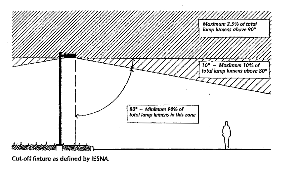 To control glare, all light fixtures shall have a cut-off angle of less than 90 degrees, except decorative pedestrian fixtures of 100 watts or less.