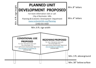 An applicant requesting a zoning map amendment, conditional use request or planned unit development request shall allow the City to place a sign(s) indicating the requested zoning map amendment, conditional use request or planned unit development request. The sign shall be placed on the site no less than 15 days prior to the scheduled public hearing. The sign shall be clearly visible from an adjoining roadway. Parcels with frontage on multiple roads, may have a sign placed along each road frontage or may have a single sign placed at the intersection of the two roadways that is clearly visible in each direction. The sign will not be placed within a public right-of-way, nor will the sign obstruct clear vision for motorists.