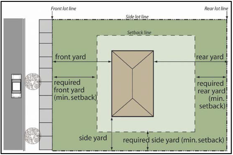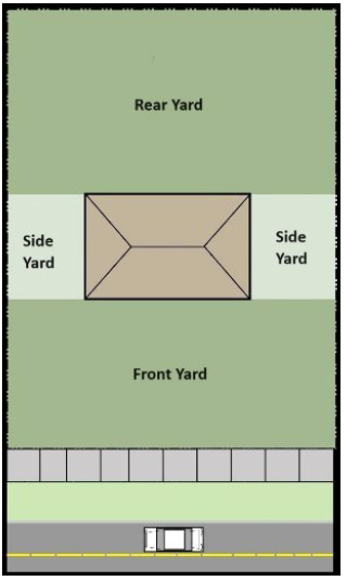 Yard, required. The open area within the required minimum setback, on all four sides of a building.