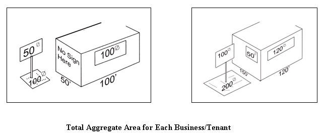 Such signs must not exceed a maximum area of one hundred (100) square feet and a maximum height of twenty (20) feet, provided that the area of a freestanding sign must not exceed the aggregate sign area allowed for the premises as measured by the most proximate building wall;