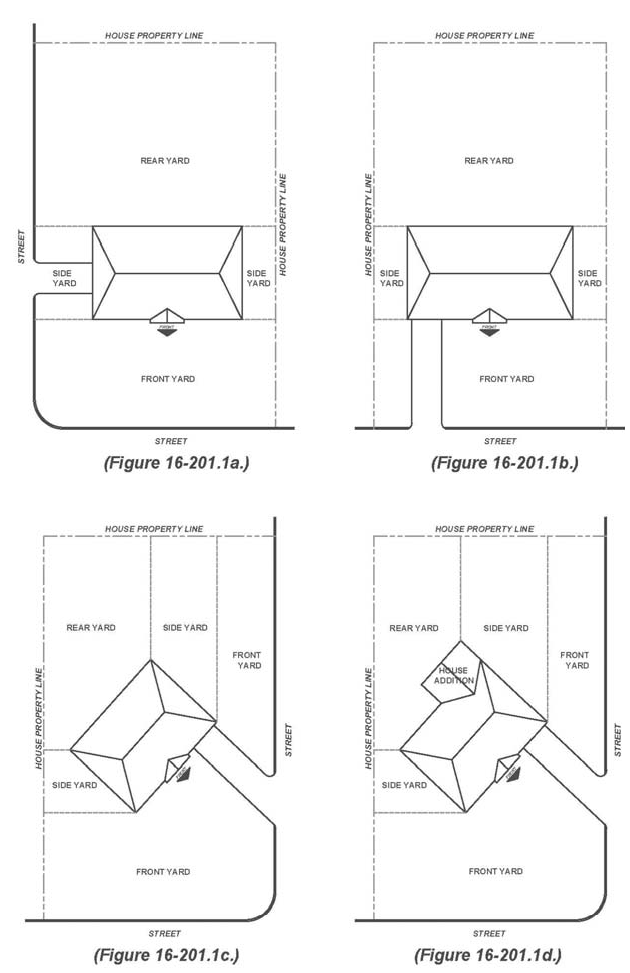 Yard, front is a yard extending across the front of a lot between the side property lines and being the minimum horizontal distance between the front yard property line and the main building or any projection thereof other than steps, unenclosed balconies and unenclosed porches. The property line is a line common to the adjacent right-of-way (ROW), other than an alley. For corner lots, the front property line will generally be the side with the least dimension. The Building Inspector will make a determination. (See Figures 16-201.1a through 16-201.1d.) Exception: When the house faces a corner, the house will have two front yards. (See Figures 16-201.1c and 16-201.1d.)