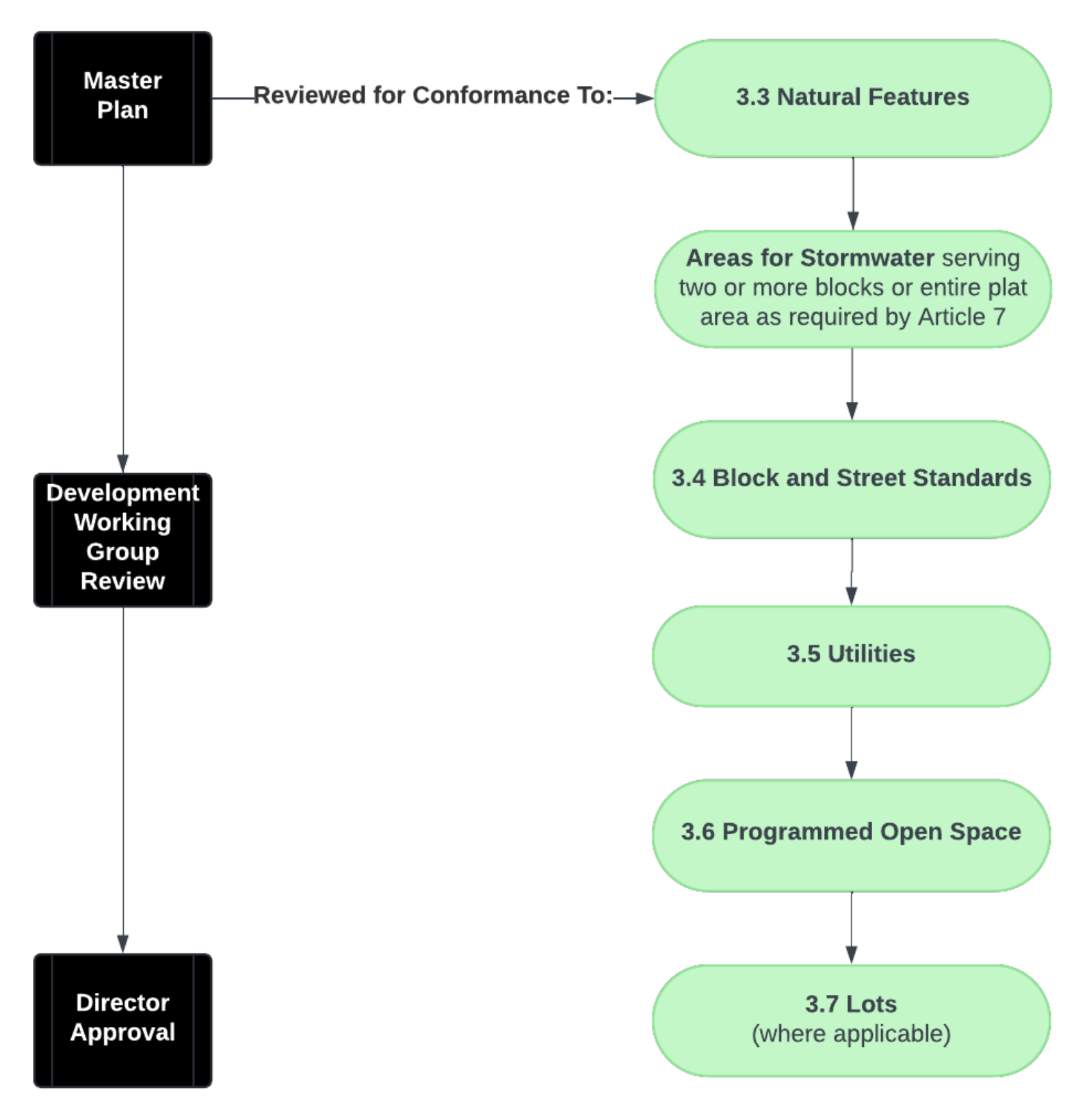 Where a Master Plan is required according to 2.4.2 an application for public improvement plan review may be filed before approval of the corresponding Master Plan subject to consent to do so given by the Director. However, public improvement plans filed before the Master Plan will not be reviewed.