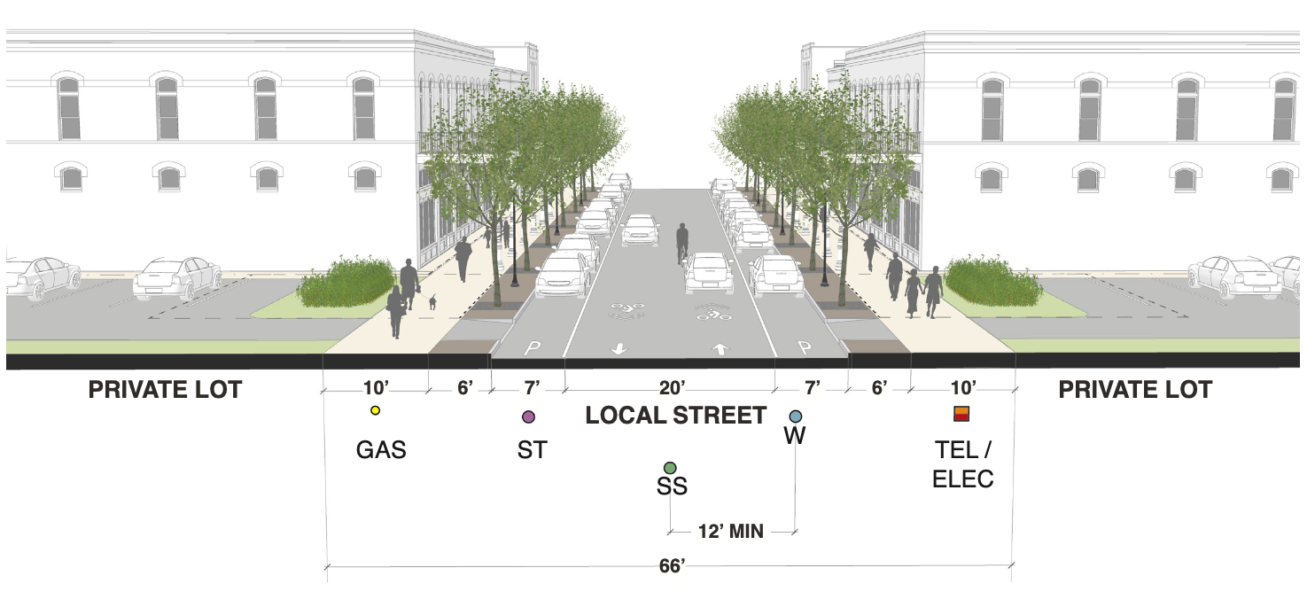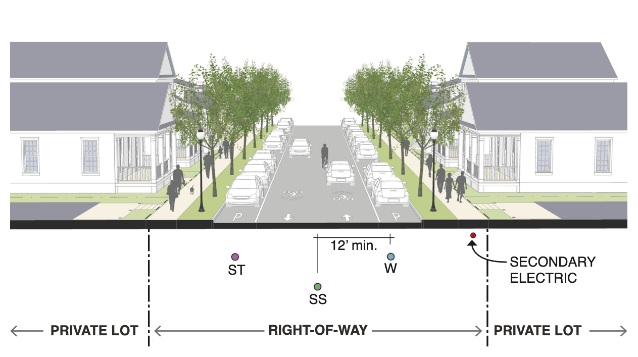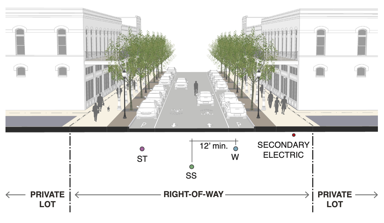 | Sewer | Required between curbs; 12 ft. min. separation from water | (Alternative)Below pavement, 5 ft. min. separation | |||||