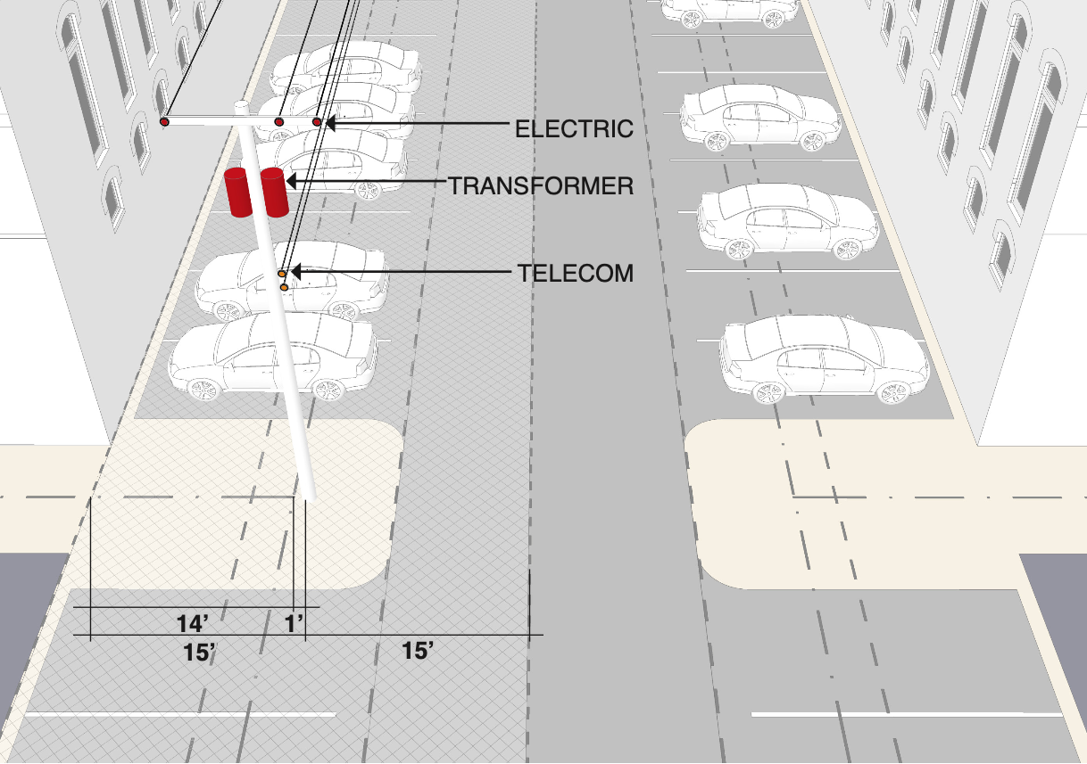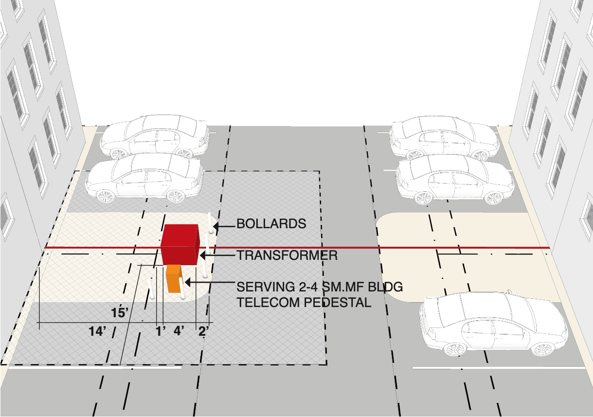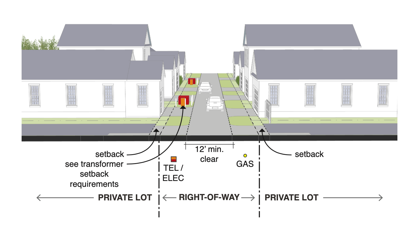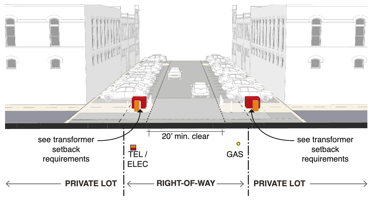 Power, telecom, natural gas must be below streets and alleys between the edges of pavement or in a required or permitted exterior yard. Their related transformers and pedestals may be located above grade only as follows: