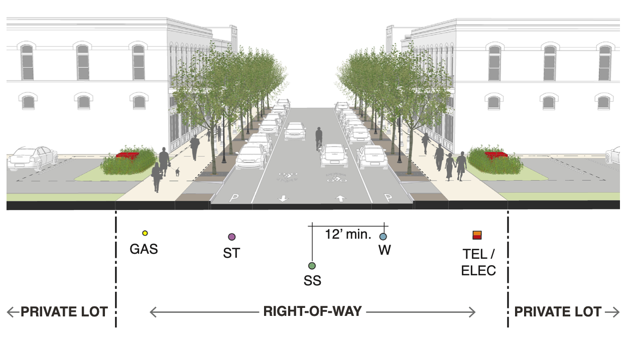 Sanitary sewer, stormwater, and water must be below streets, alleys, and mews between the edges of pavement. They may be located below street alternatives or programmed open spaces where they do not create a conflict with required placement or design of features at and above the surface, such as trees.