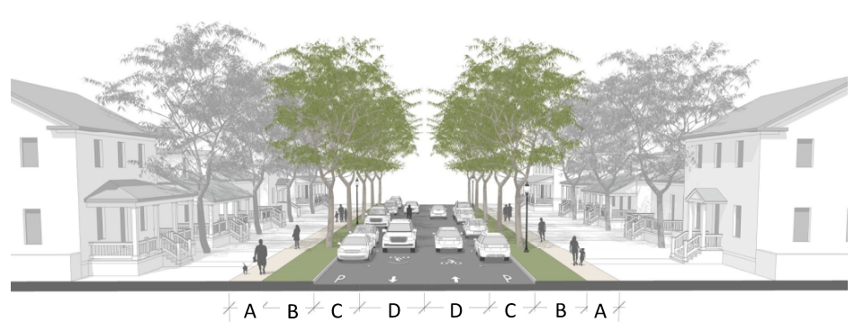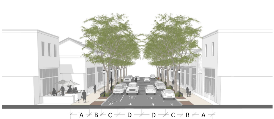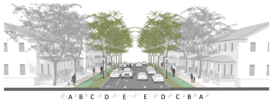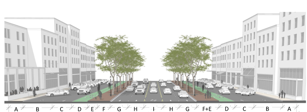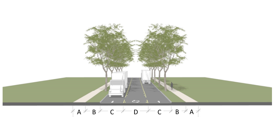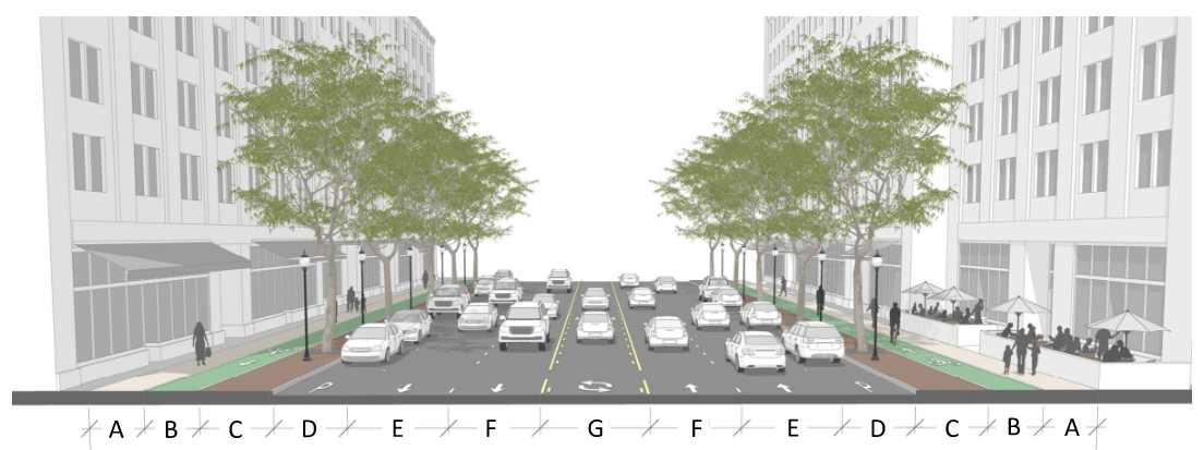B-58A (subtypes may not change mid-block) | 10' concrete sidewalk | 18' angled parking | 12' travel lane | 8' parallel parking | 10' bi-directional green bike lane | 58' | 6' concrete sidewalk | 10' softscaped tree lawn | 12' median, bioswale, or center turn lane | 50' | Nonresidential design required. See 4.5.6. | Any use permitted by zoning. | ||