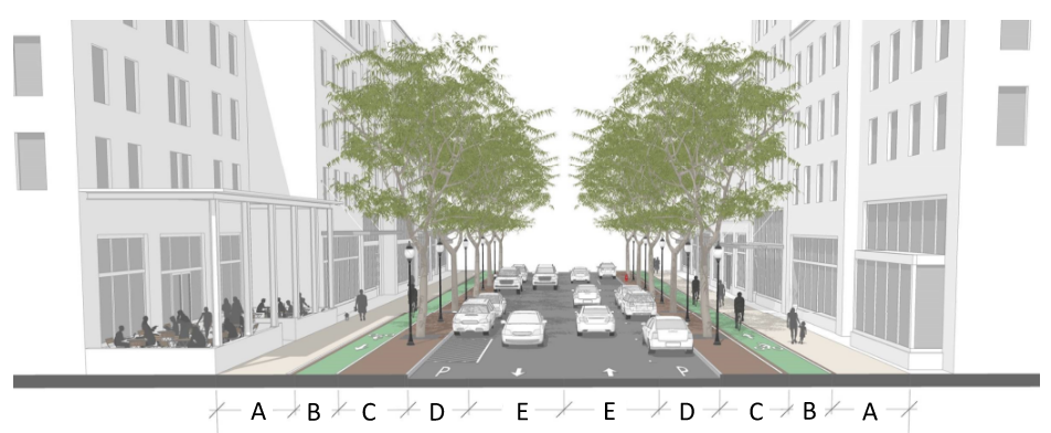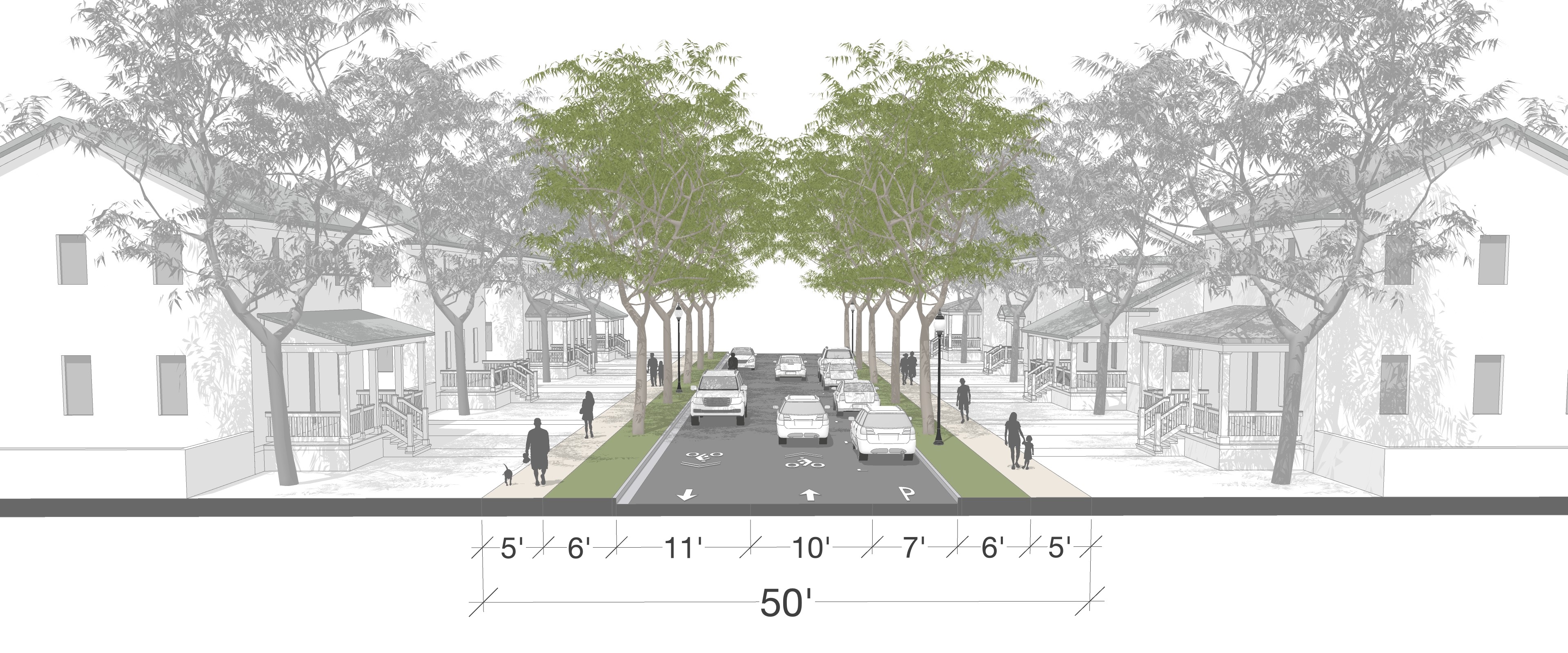 B-50 (subtypes may not change mid-block) | 10' concrete sidewalk | 18' angled parking | 12' travel lane | 10' bi-directional green bike lane | 50' | 6' concrete sidewalk | 10' hardscaped street tree and furniture zone | 12' median, bioswale, or center turn lane | 50' | Nonresidential design required. See 4.5.6. | Any use permitted by zoning. | |||