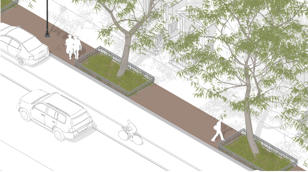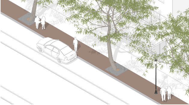 Surface: Between Tree Planters | Hardscape: To match sidewalk, unit pavers, or pervious pavement | |