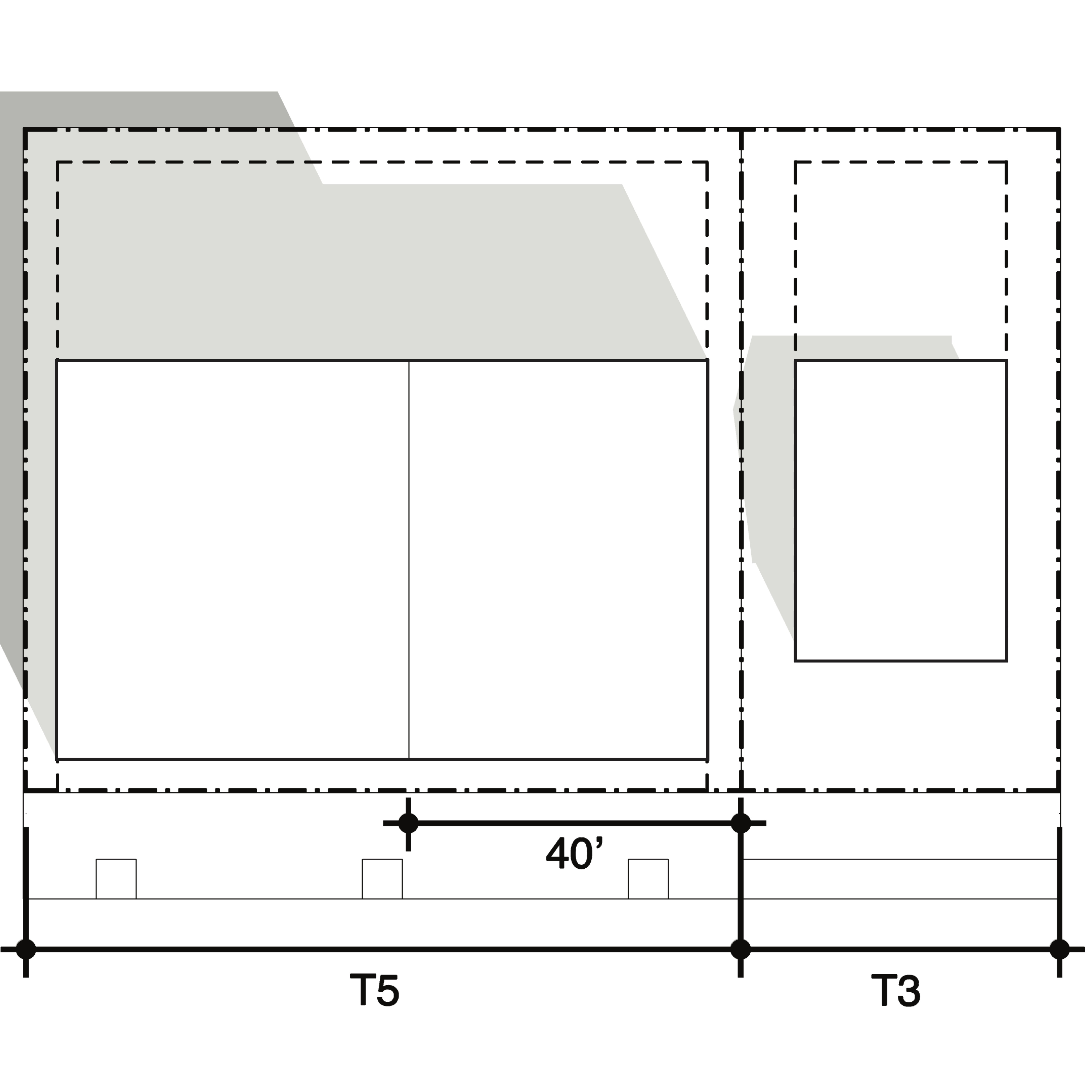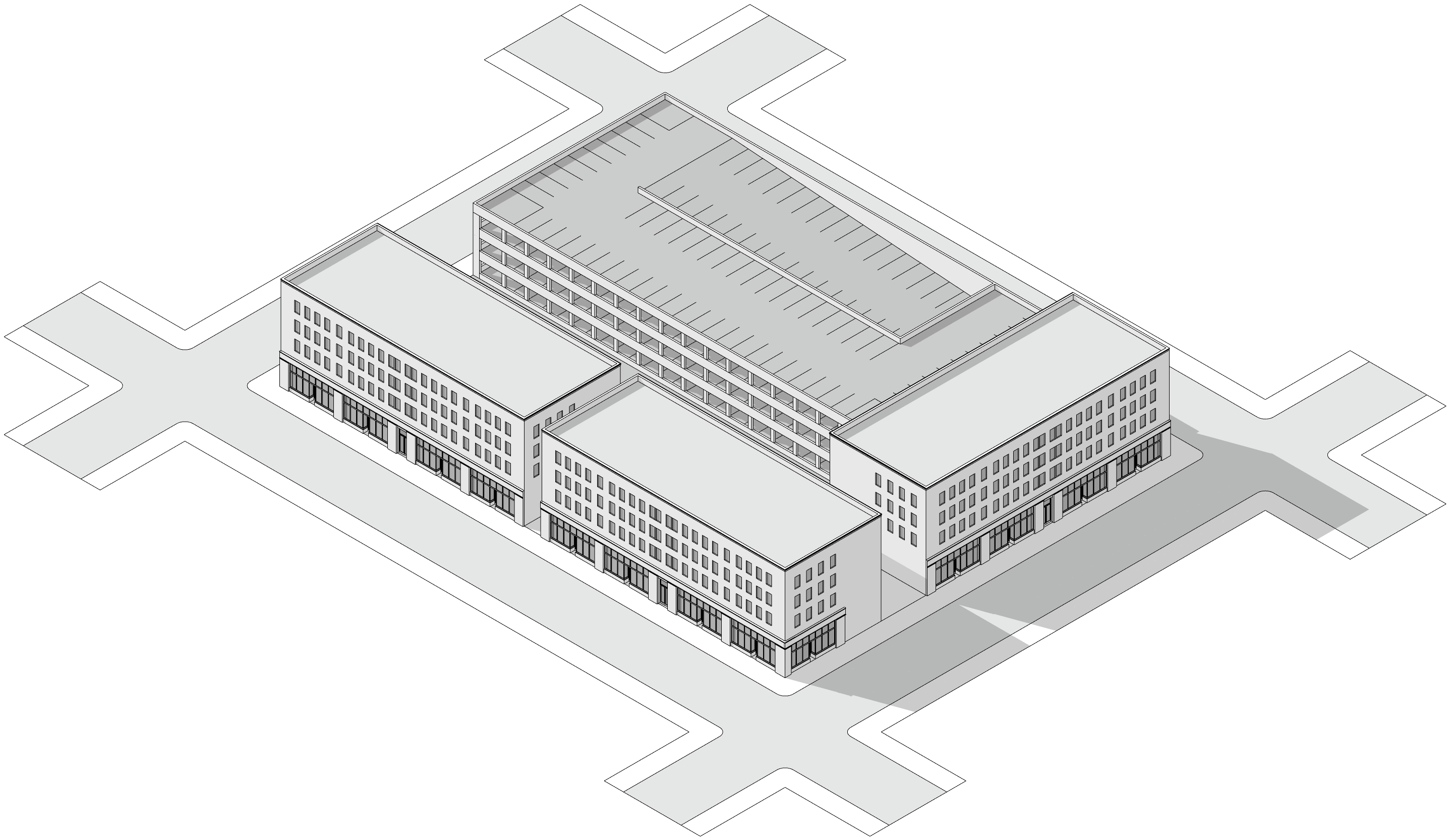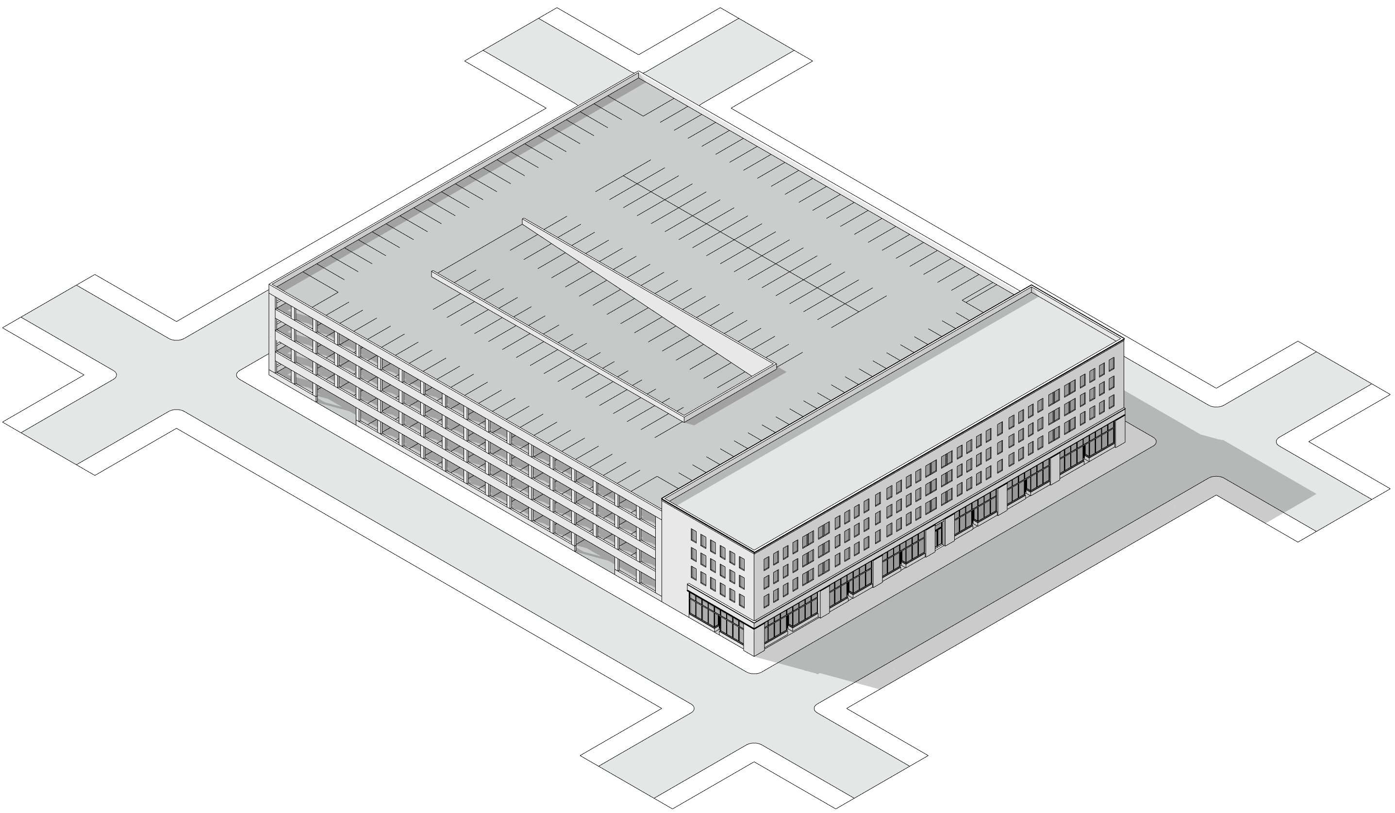 B | Parking tray - single-loaded | E | Planter and walkway between every 3 trays |