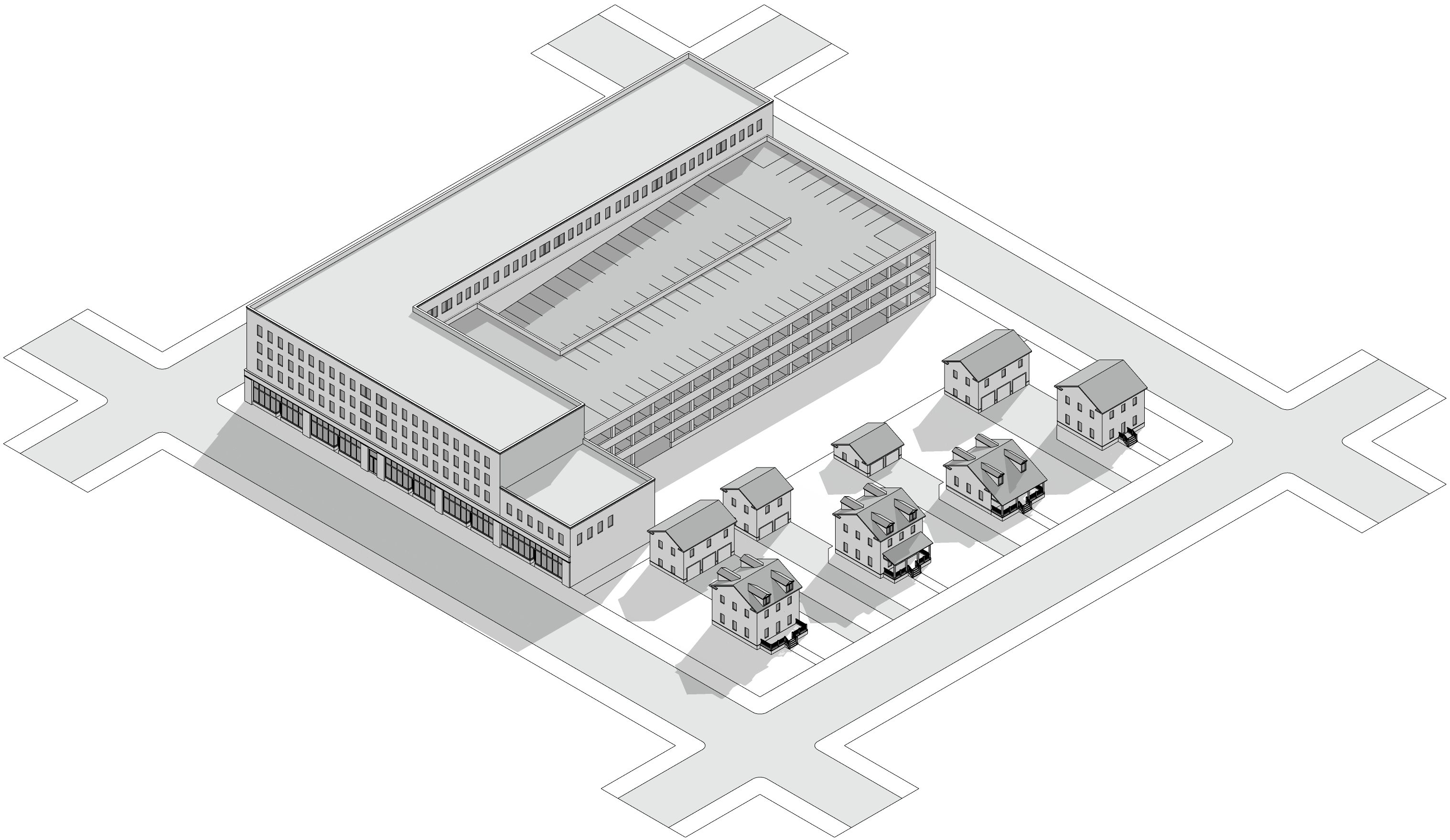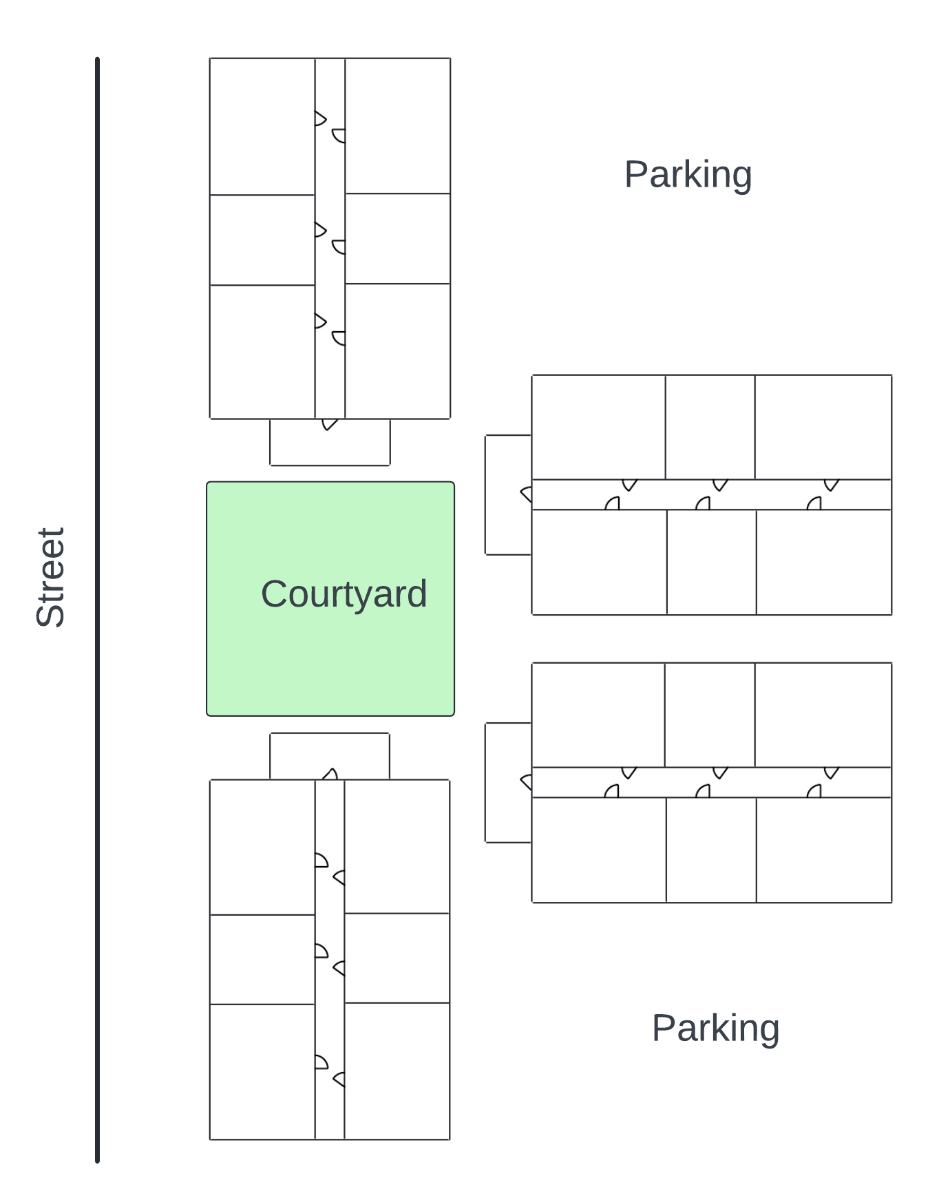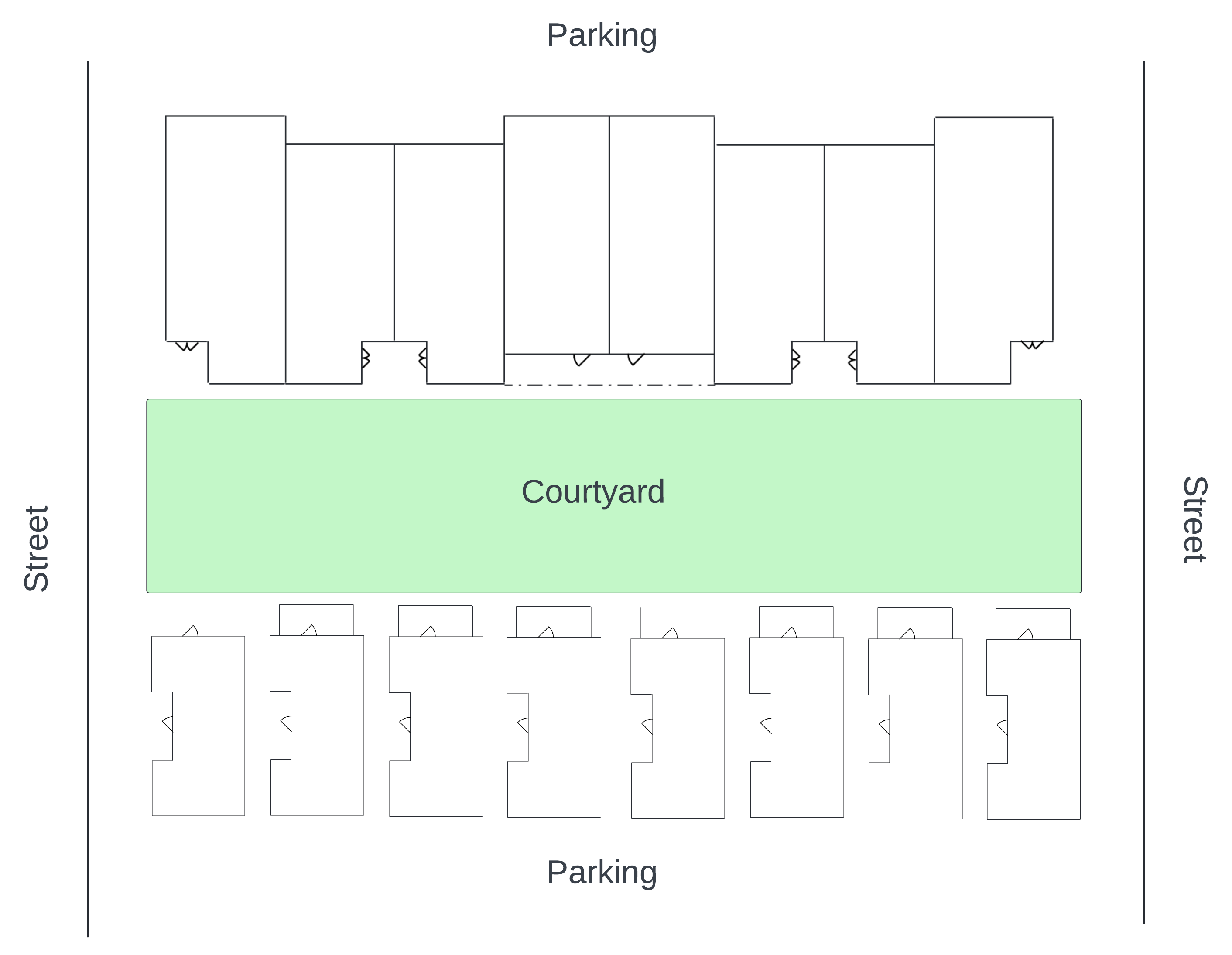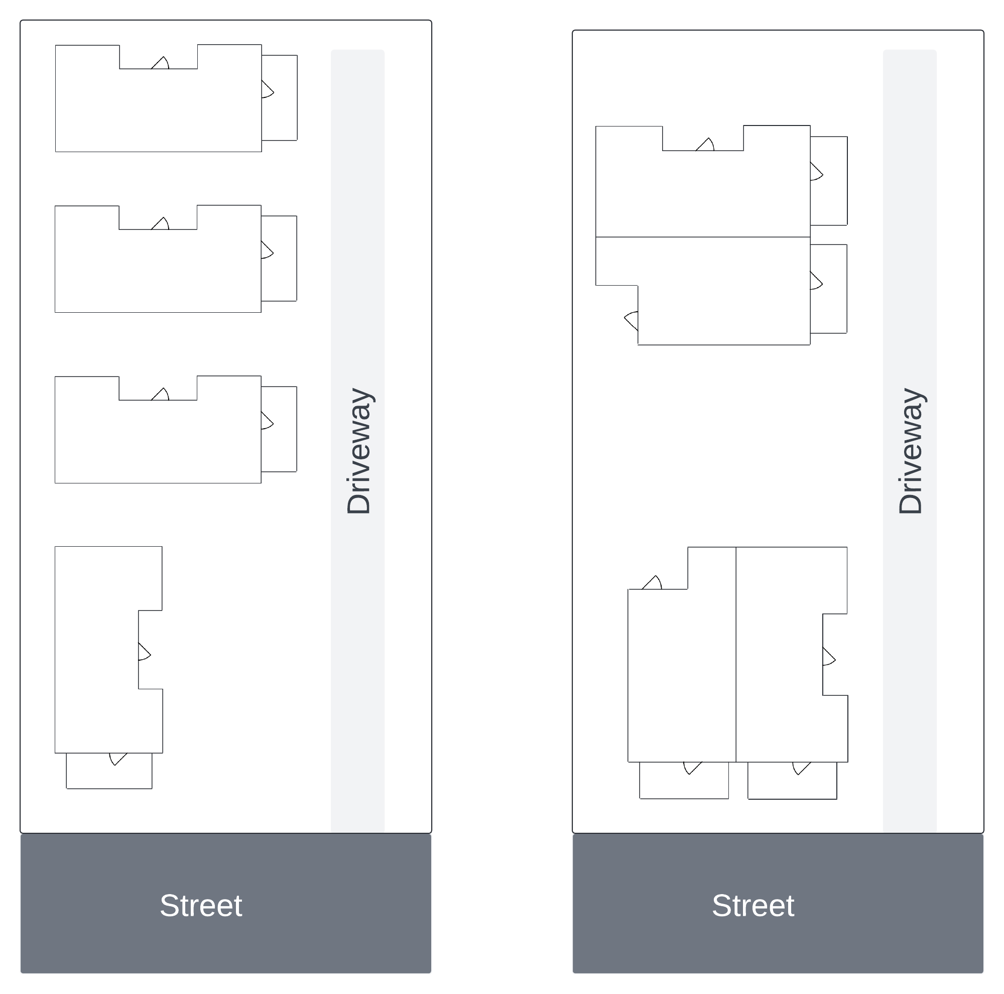 ![]() Forecourt arrangement with duplexes | ![]() Forecourt arrangement with multi-unit houses |