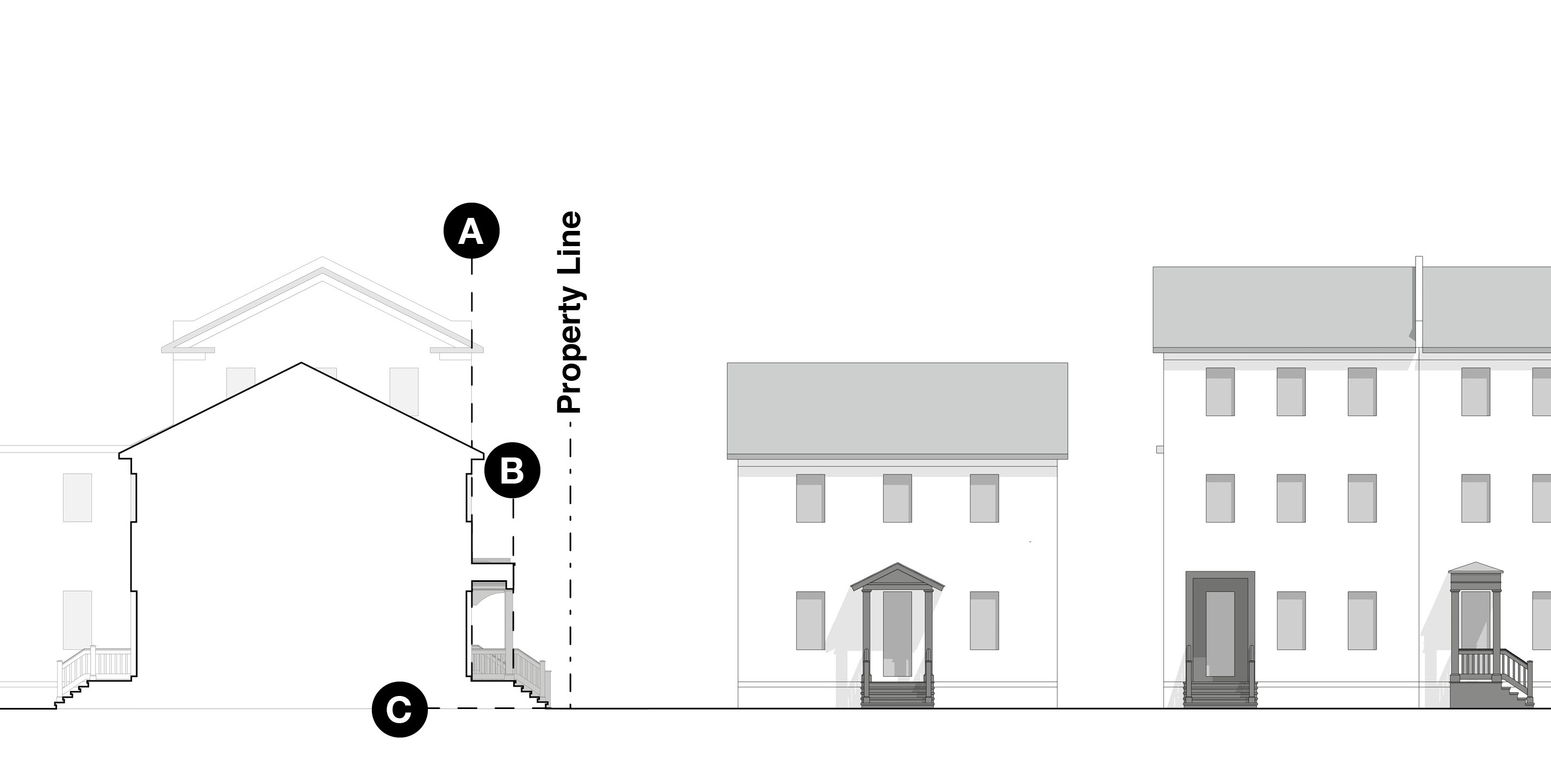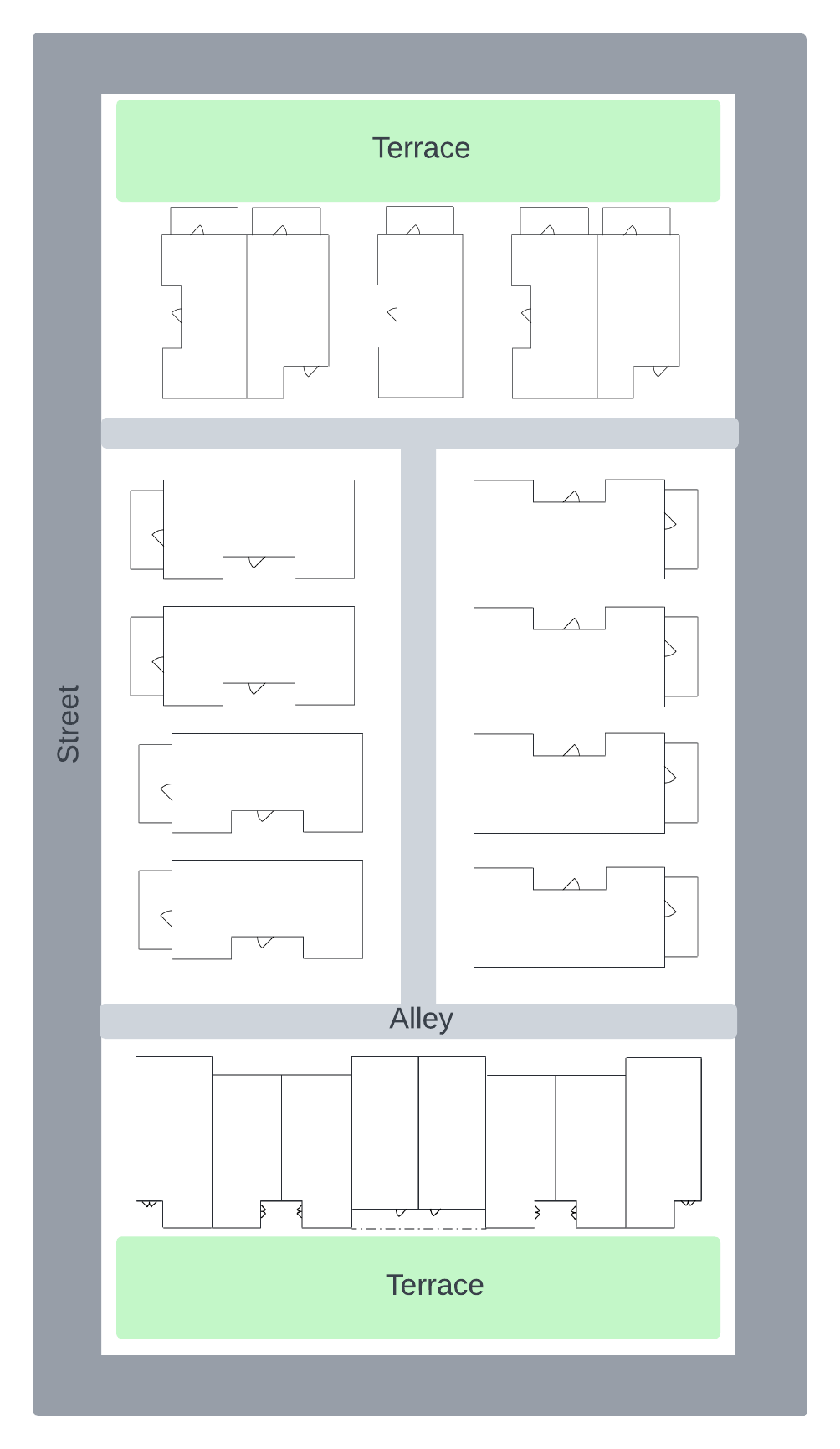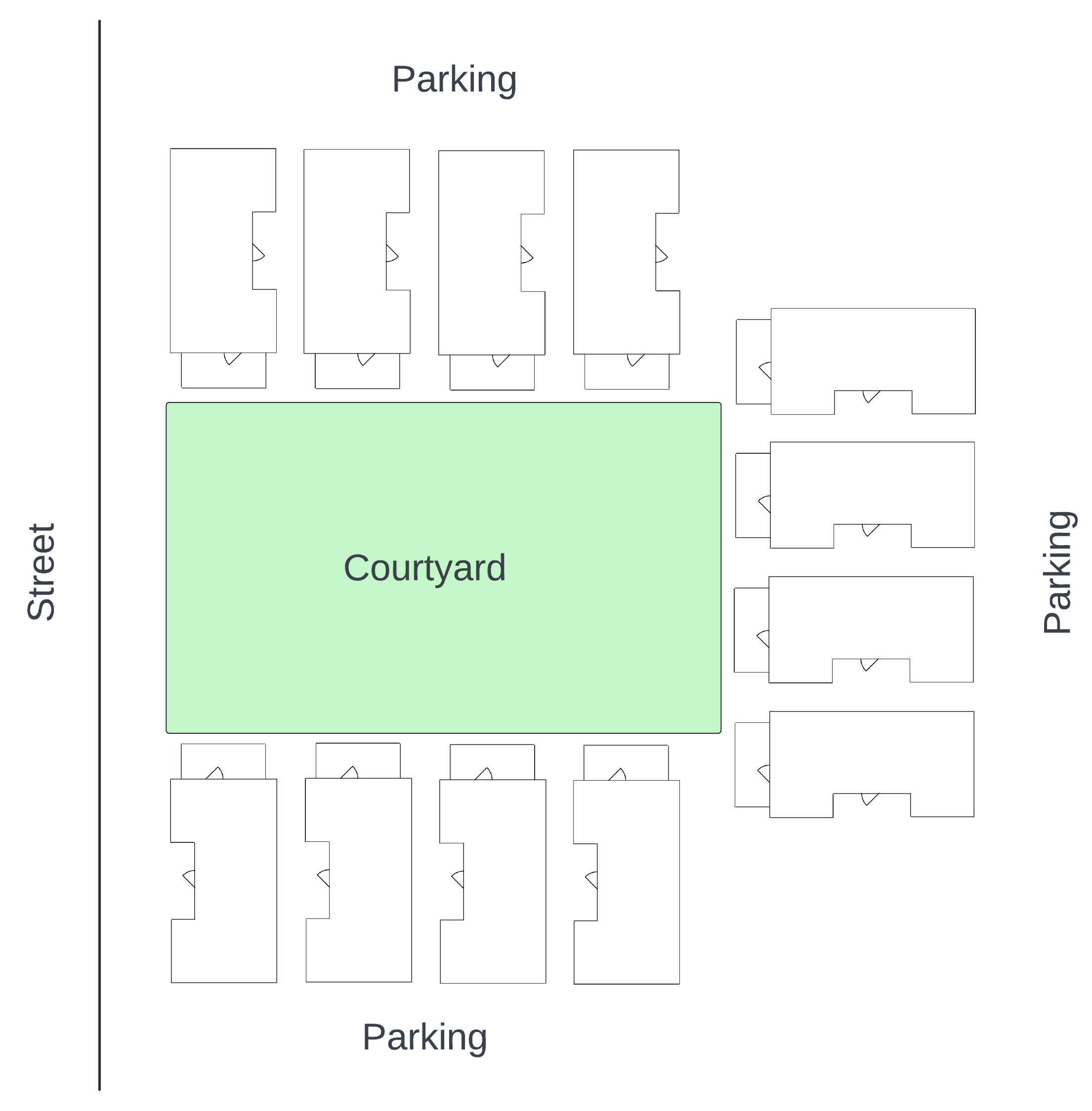 ![]() Forecourt arrangement with cottage houses | ![]() Throughcourt arrangement with cottage houses and town houses |