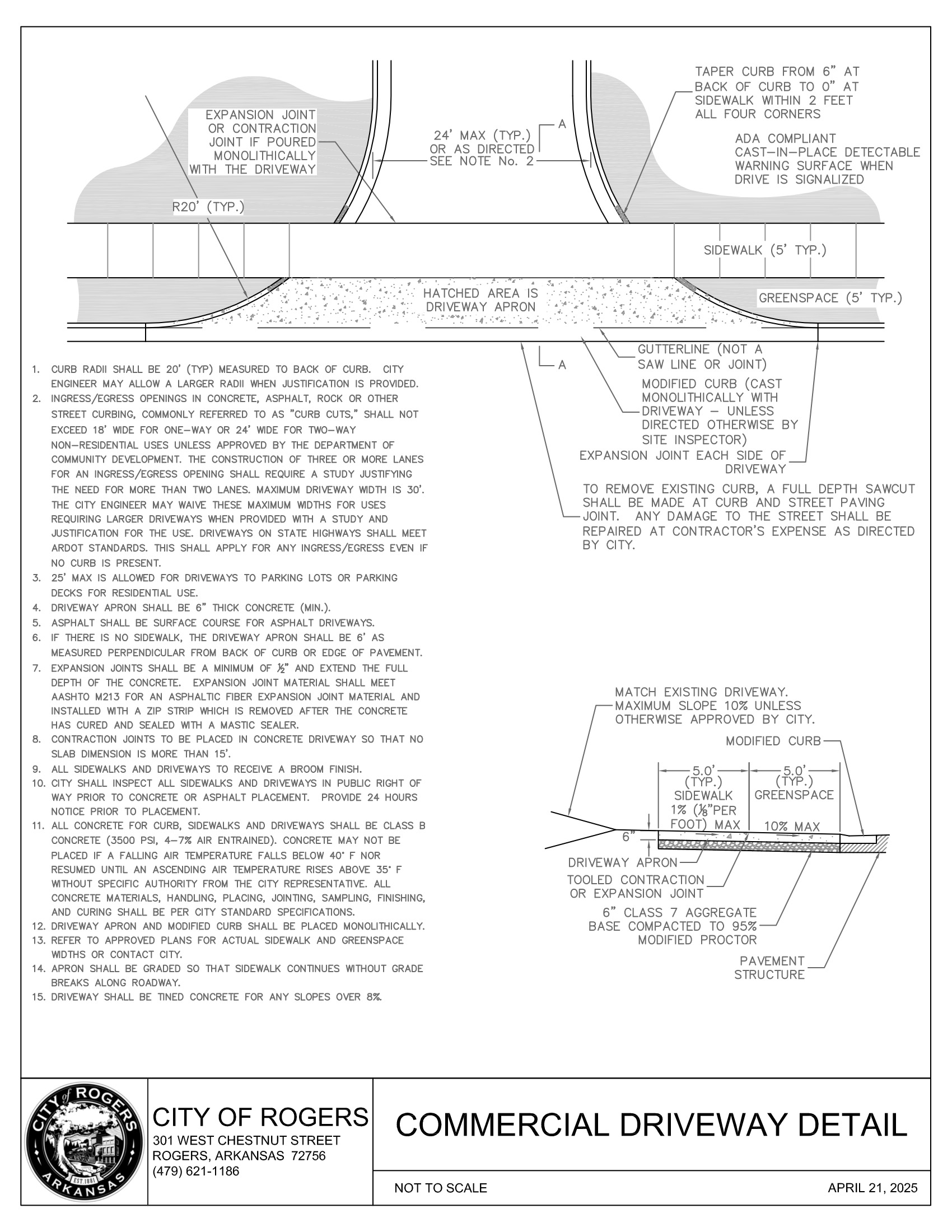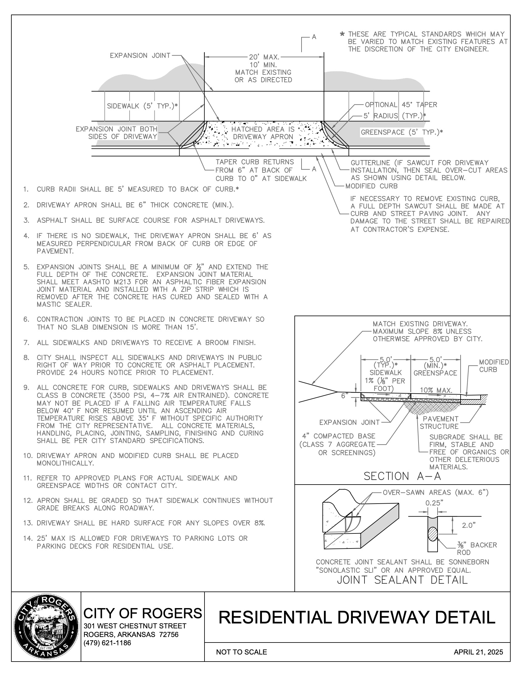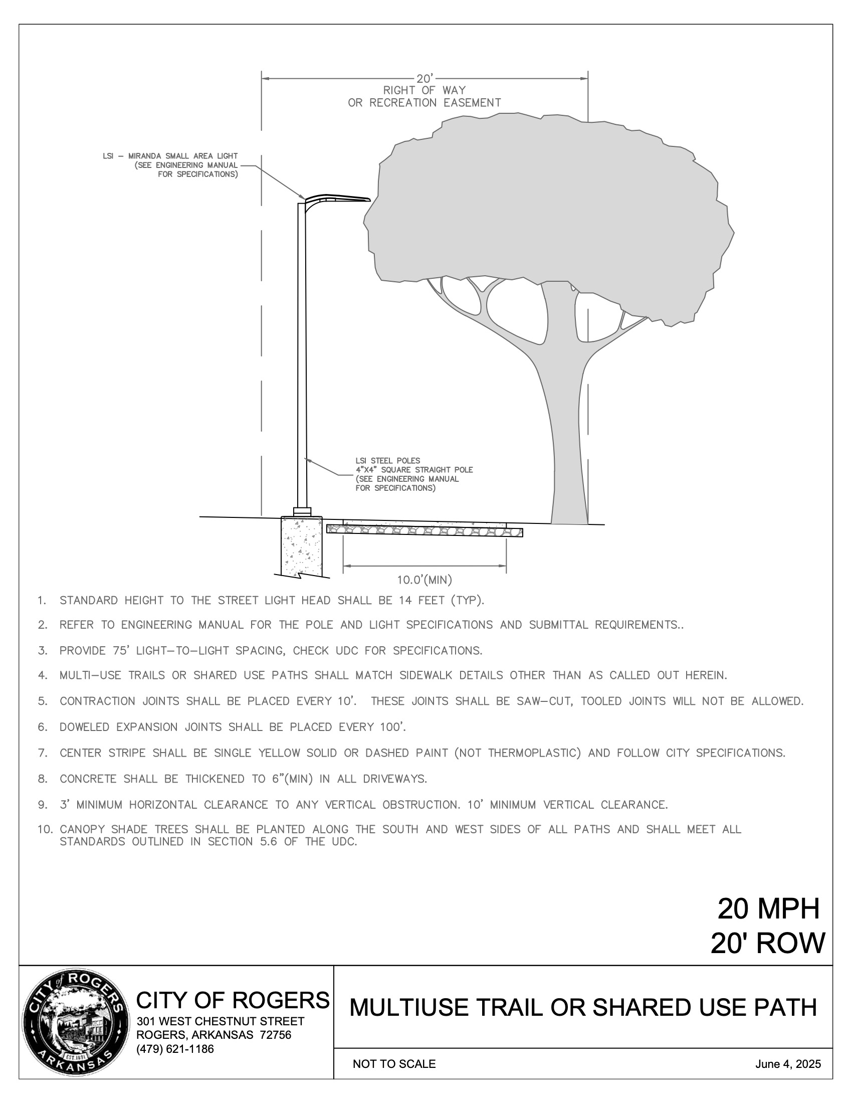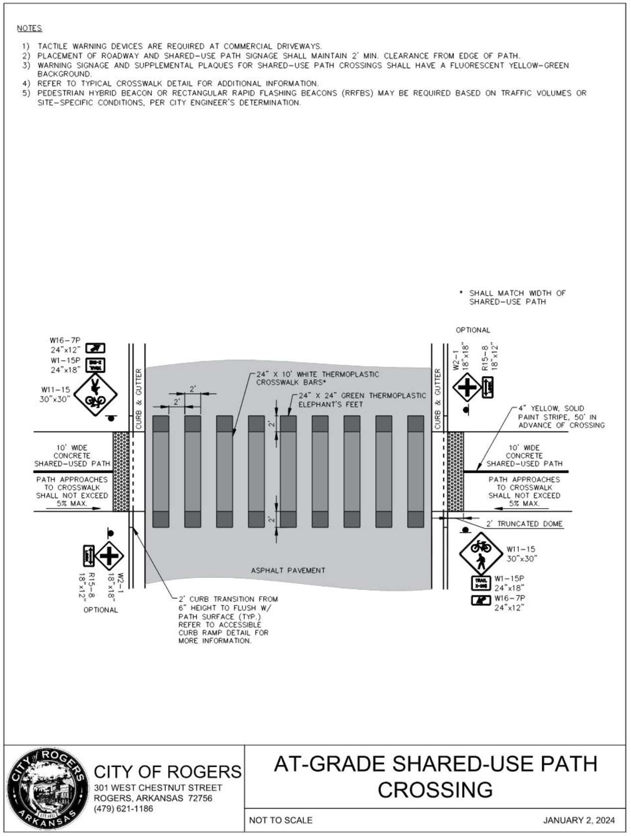 1. ROW width may vary from the typical shown. 2. Measured from centerline of driveway to ROW of the intersecting street. 3. Superelevations greater than 2% require City Engineer approval. 4. Grades over 8% require approval by City Engineer. 5. Cross-slopes over 2% require approval by City Engineer and shall not be used where it would violate PROWAG. | ||||