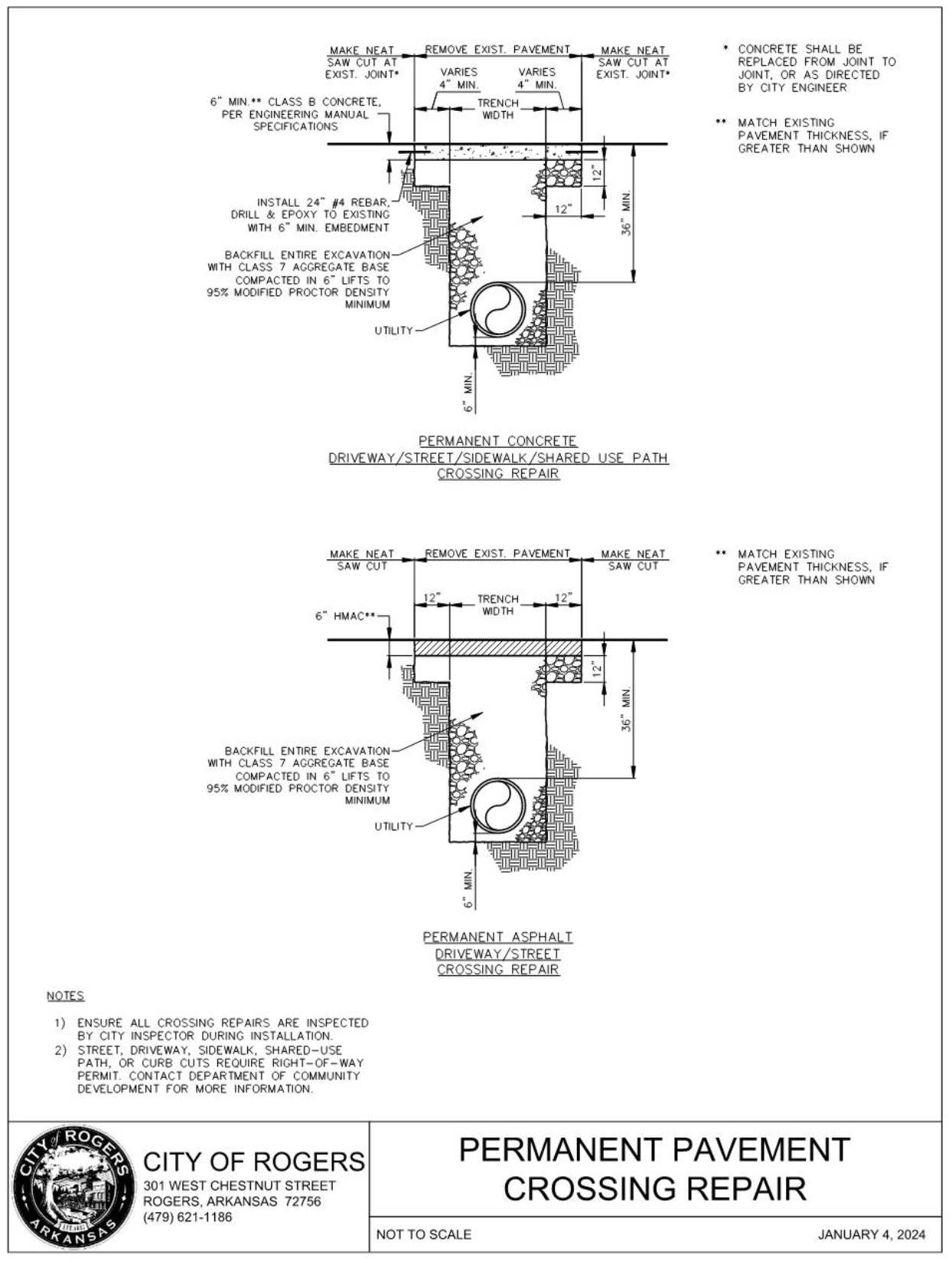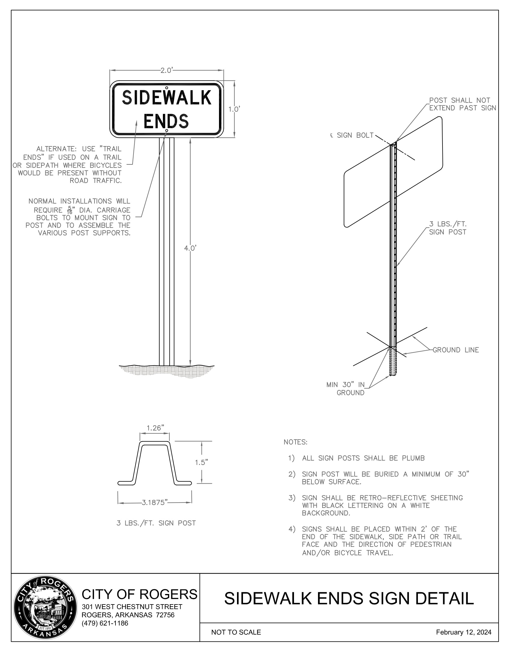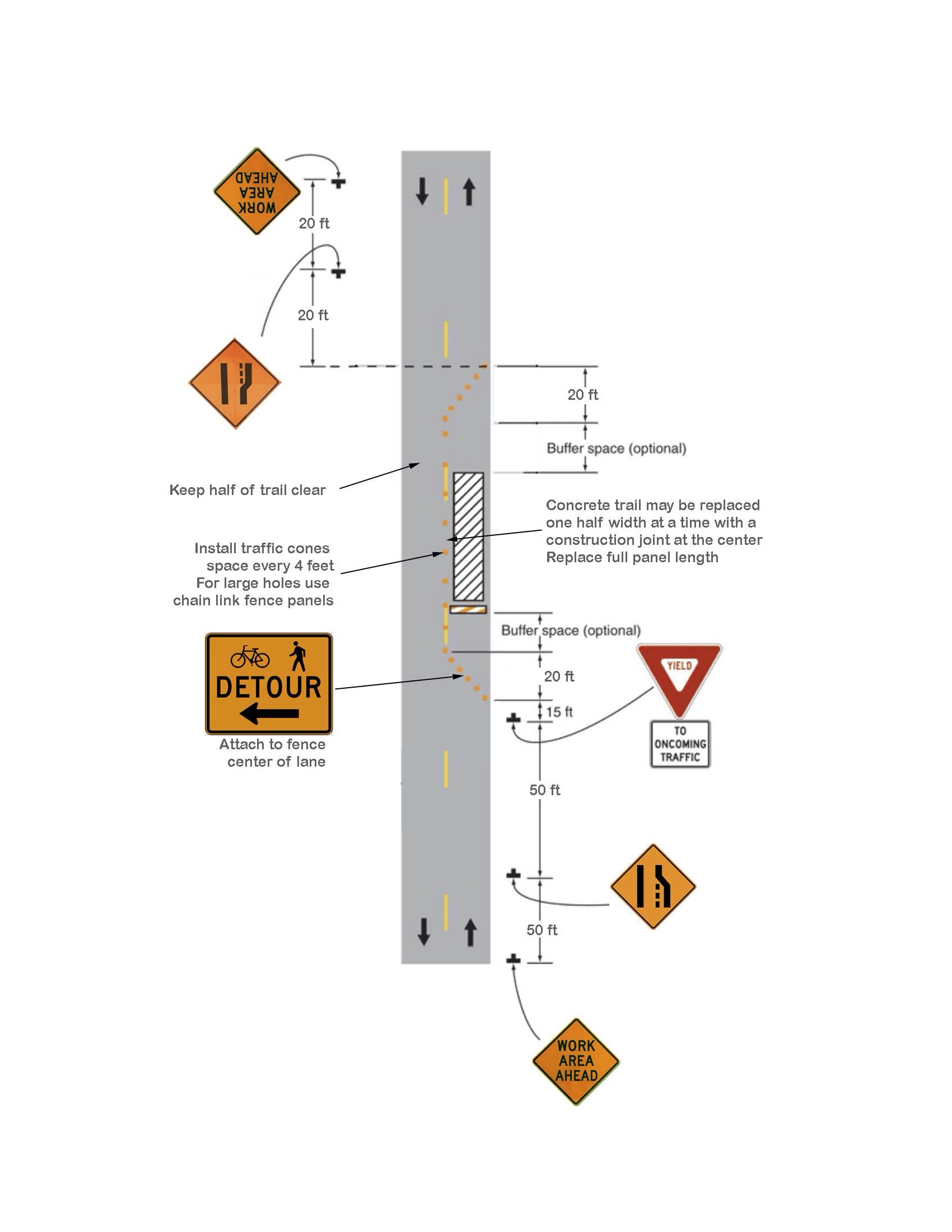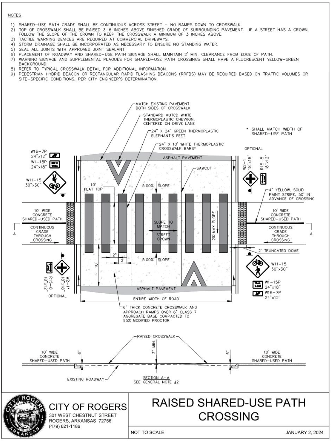 These standards are adapted from Part 6 of the most current version of Manual on Uniform Traffic Control Devices (MUTCD) and is required to be used when construction activities impact the safe operation and functionality of any City of Rogers pedestrian and/or bicycle facility. Exemptions may be appealed to the City Engineer. All efforts should be taken to keep pedestrian and/or bicycle facilities open and safe for users at all times.