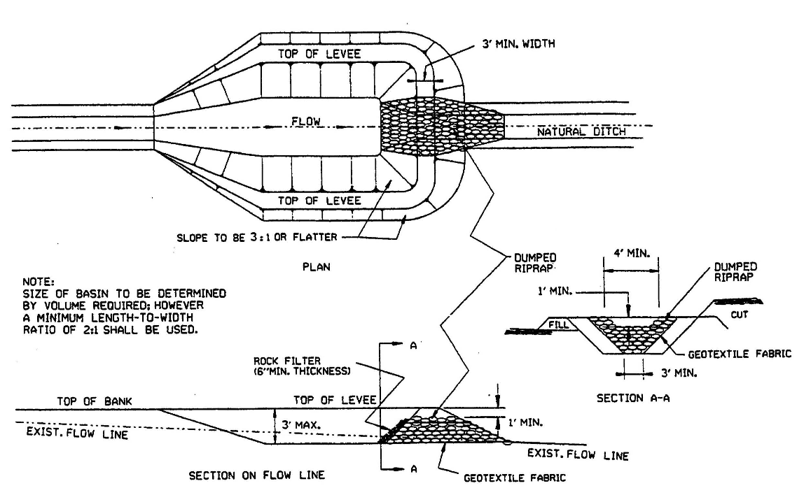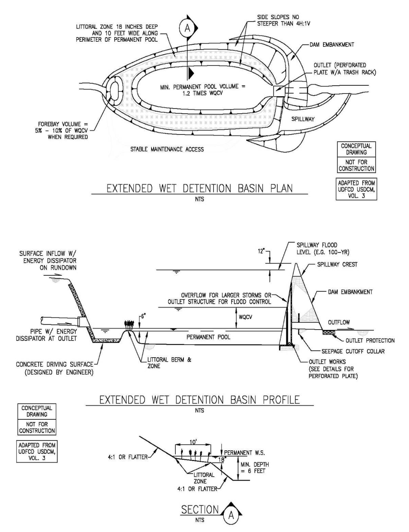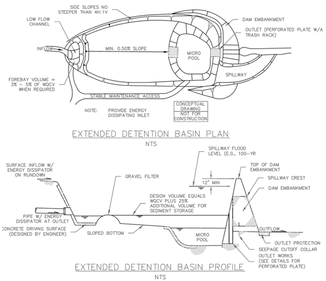 The forebay of an extended dry detention basin, if specified by design engineer, can play a critical role in maintaining the ability of the filter media to infiltrate water by removing coarse sediments that would otherwise deposit on the pond bottom. Even with this pretreatment, periodic maintenance will be required to maintain infiltration capacity. Routine maintenance should include: