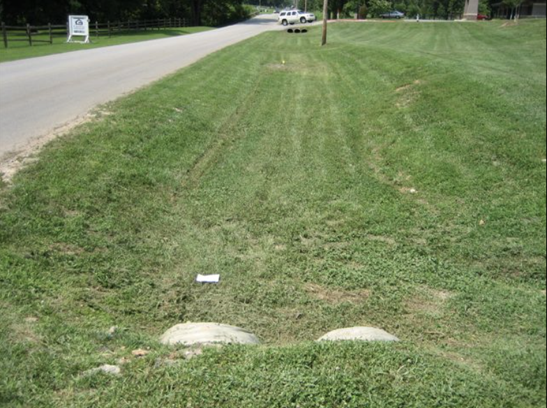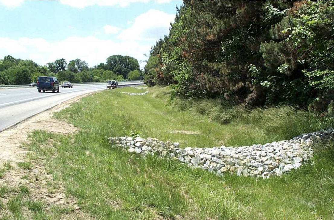 This grass swale filters runoff from a road and helps reduce flow velocities.