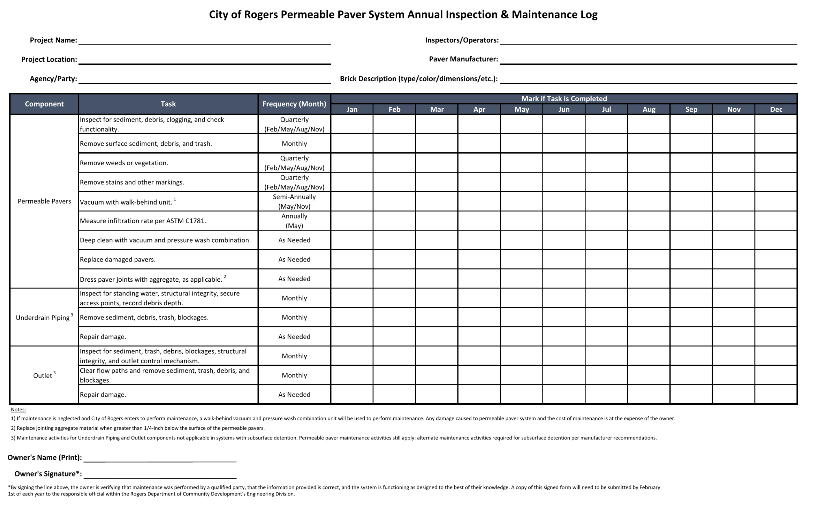 Because Rogers is located in Benton County, any work considered to be covered under one of the several Nationwide Permits authorized by the USACE still requires the submittal of an “APPLICATION FOR DEPARTMENT OF THE ARMY PERMIT – 33 CFR 325”. Additional requirements needed to complete this permit include, but are not limited to, the following: