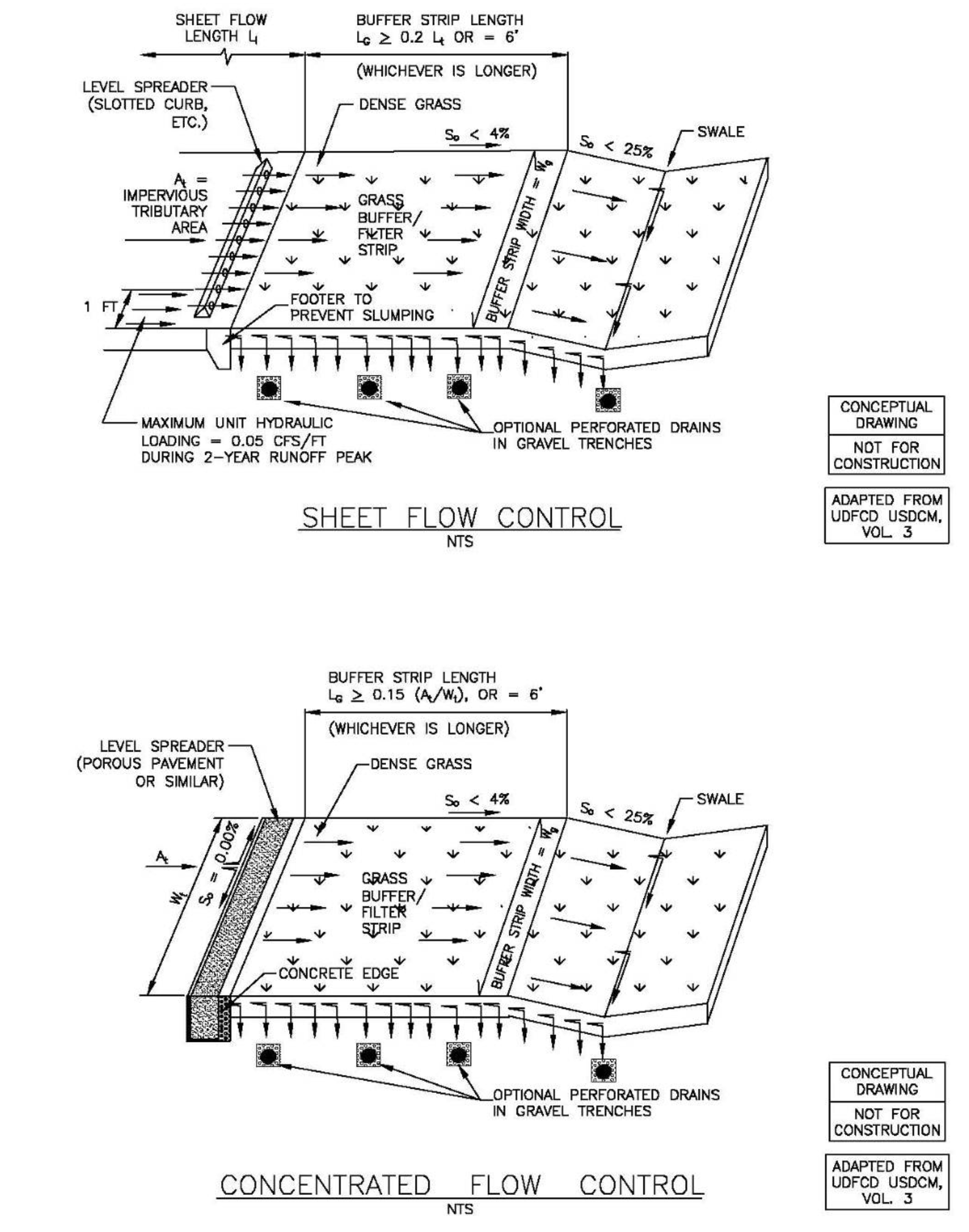 Use of a swale as a grass buffer – If one or both sides of the grass swale are also to be used as a grass buffer, the design of the grass buffer must incorporate the requirements of Section 4.6.