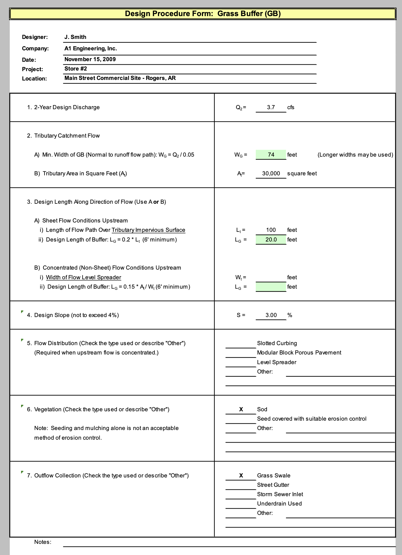 The following steps outline the grass swale design procedure and criteria. Figure WQ-11 is a schematic of a grass swale facility and its components. The Grass Swale (GS) Worksheet in the BMP Spreadsheet will aid in the design procedure using the steps described below.