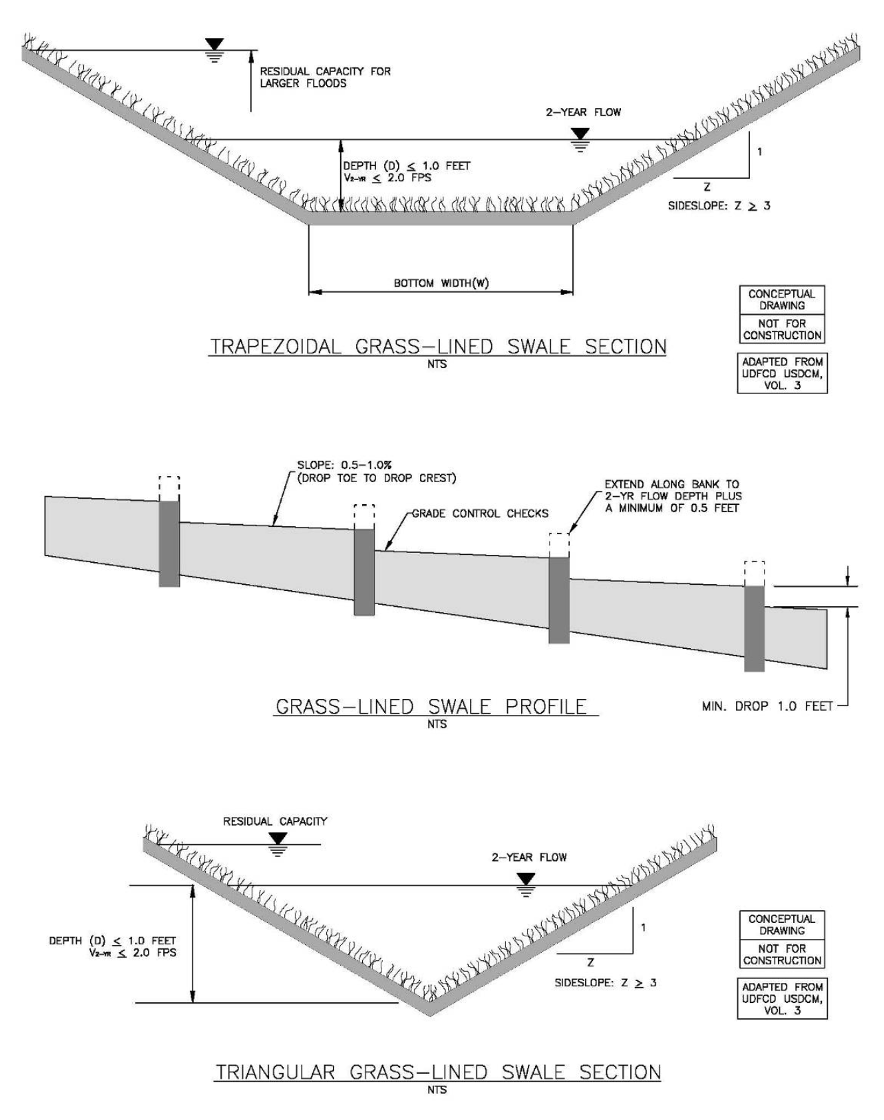 Swale slope – A grass swale is sized to maintain a low velocity during small storms and to collect and convey larger runoff events. A grass swale generally shall not be used where site slopes exceed 5 percent. The longitudinal slope of a grass swale shall be 0.5 to 1 percent, which often necessitates the use of grade control checks or drop structures. Figure WQ-11 shows trapezoidal and triangular swale configurations.
