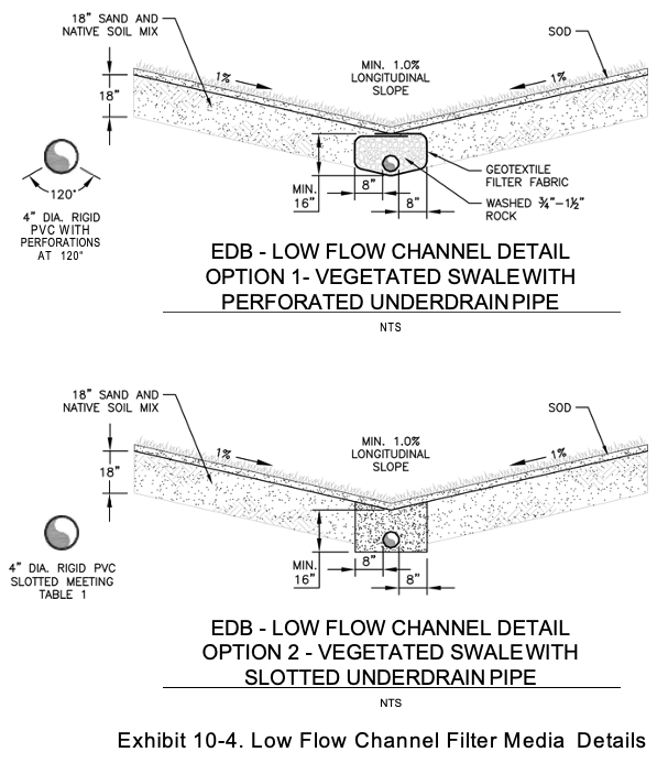A layer consisting of 18-inches of the filtration media described above should be installed beneath the top stage floor, low flow channel and micro-pool as shown in Exhibits 10-3 and 10-4, EDB Filtration Media and Low Flow Channel Details. The filtration media is not intended to be the primary outlet for the extended dry detention pond, instead, it is meant to provide a high level of treatment via filtration for water that infiltrates through the pond bottom while the pond is filling and draining. The pond area should be over-excavated by 18-inches and well-mixed filter media placed in the pond bottom. Filter media should not be compacted to more than 80% standard proctor. Sod is placed on top of the filter media for the top stage floor. The filter layer should be installed as one of the final steps in the construction sequence, once disturbed areas of the site have been stabilized and the forebay and pond outlet structure have been completed.