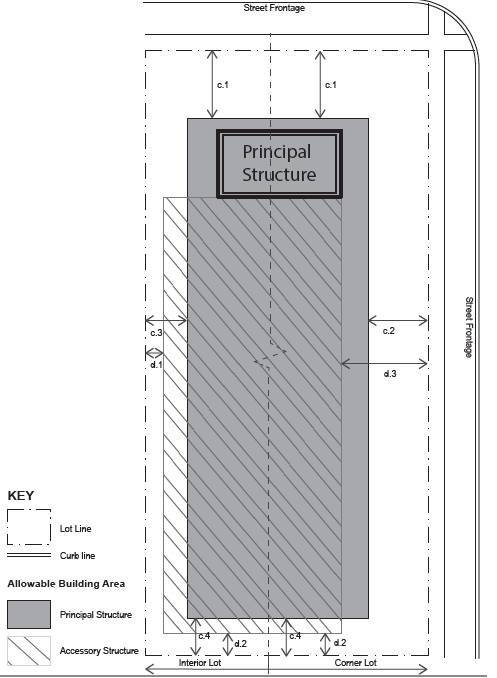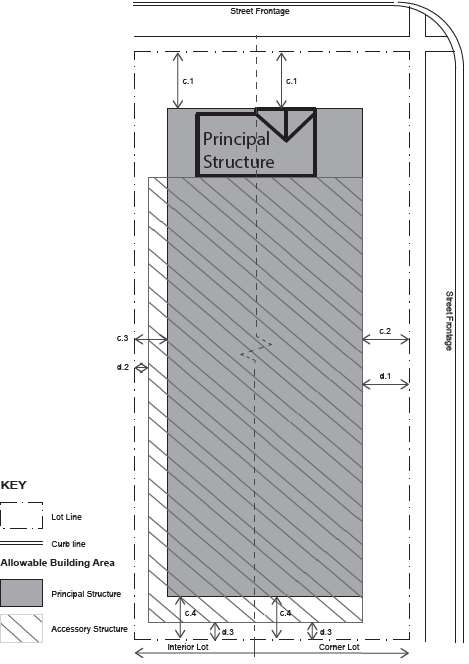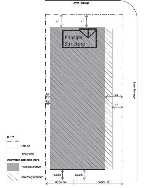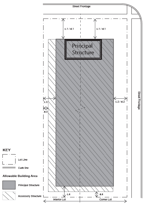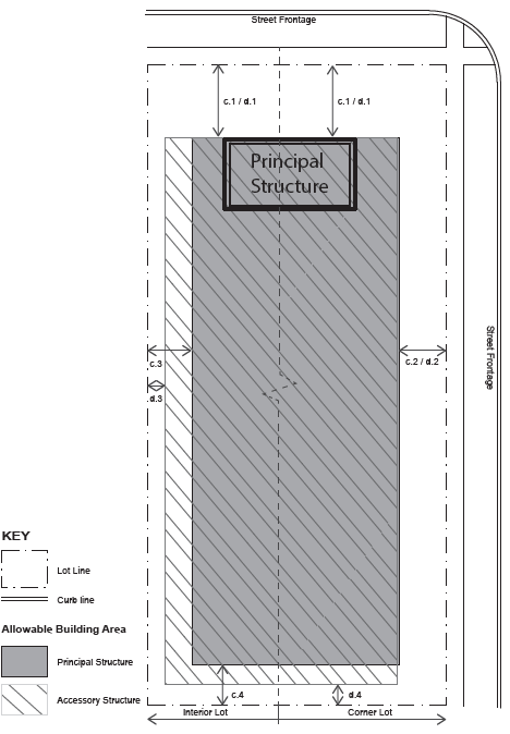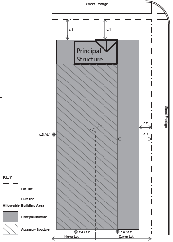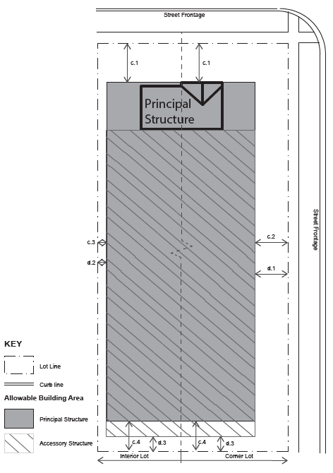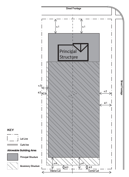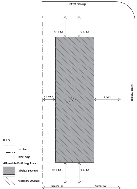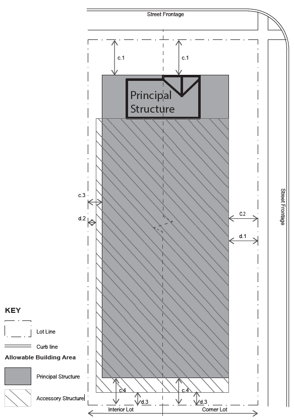 | d. SETBACKS ACCESSORY d.1 Side (Street) Setback, 25 ft. min* d.2 Side (Interior), 5 ft. min d.3 Rear Setback, 10 ft. min. * In no instance shall an accessory structure on a corner lot be located closer to the road right-of-way than an adjacent primary structure fronting the same road right-of-way. Detached accessory structures such as garages shall be placed in the rear yard. | |