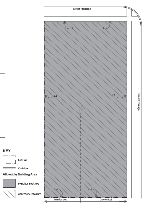 | c. SETBACKS PRINCIPAL BUILDING Principal buildings shall be distanced from the lot lines as shaded.* c.1 Principal Front Setback, 25 ft. min. c.2 Side (Street) Setback, Same as Front Setback. c.3 Side (Interior), 10 ft. min. c.4 Rear Setback, 20 ft. min. Attached front porches, uncovered steps or stoops shall be allowed to encroach 10 feet maximum within front yard setback. Overhangs may encroach 2 feet within front yard setbacks. *For setbacks adjacent to County, State, and Federal roadways, see City Code Sec. 125-83C.8 | |