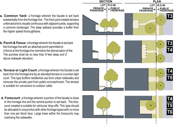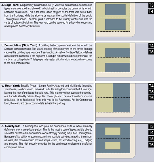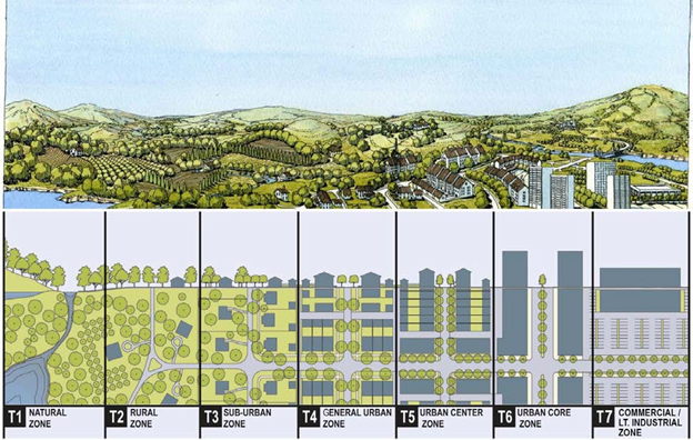 "Transect Zone." One of several areas on a Zoning Map within the SVPD. Transect Zones are administratively similar to the land use zones in conventional codes, except that in addition to the usual building use, density, height, and setback requirements, other elements of the intended habitat are integrated, including those of the private lot and building and public frontage.