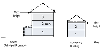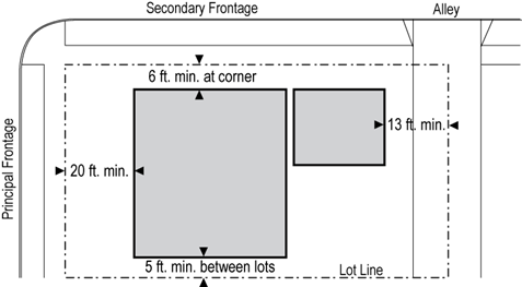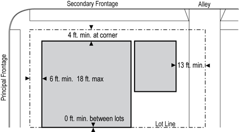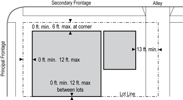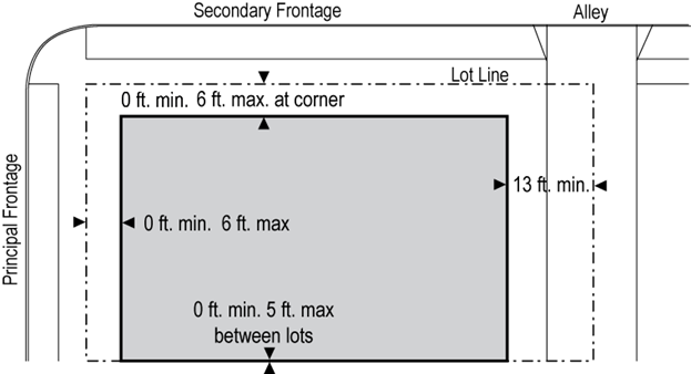 "Setback, Street Side." The required area extending from the front property line, street plan line, or access easement to the rear property line. The width of a street side setback is the minimum horizontal distance between the street side property line and a line parallel thereto with the required minimum distance determined by the development standards for the applicable zoning district for a corner or reverse corner lot.