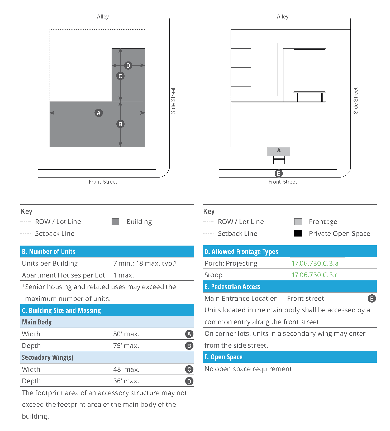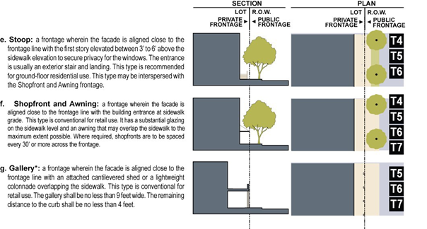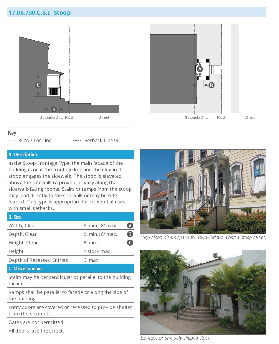 "Stoop." A Private Frontage wherein the Facade is aligned close to the Frontage Line with the first Story elevated from the Sidewalk for privacy, with an exterior stair and landing at the entrance.