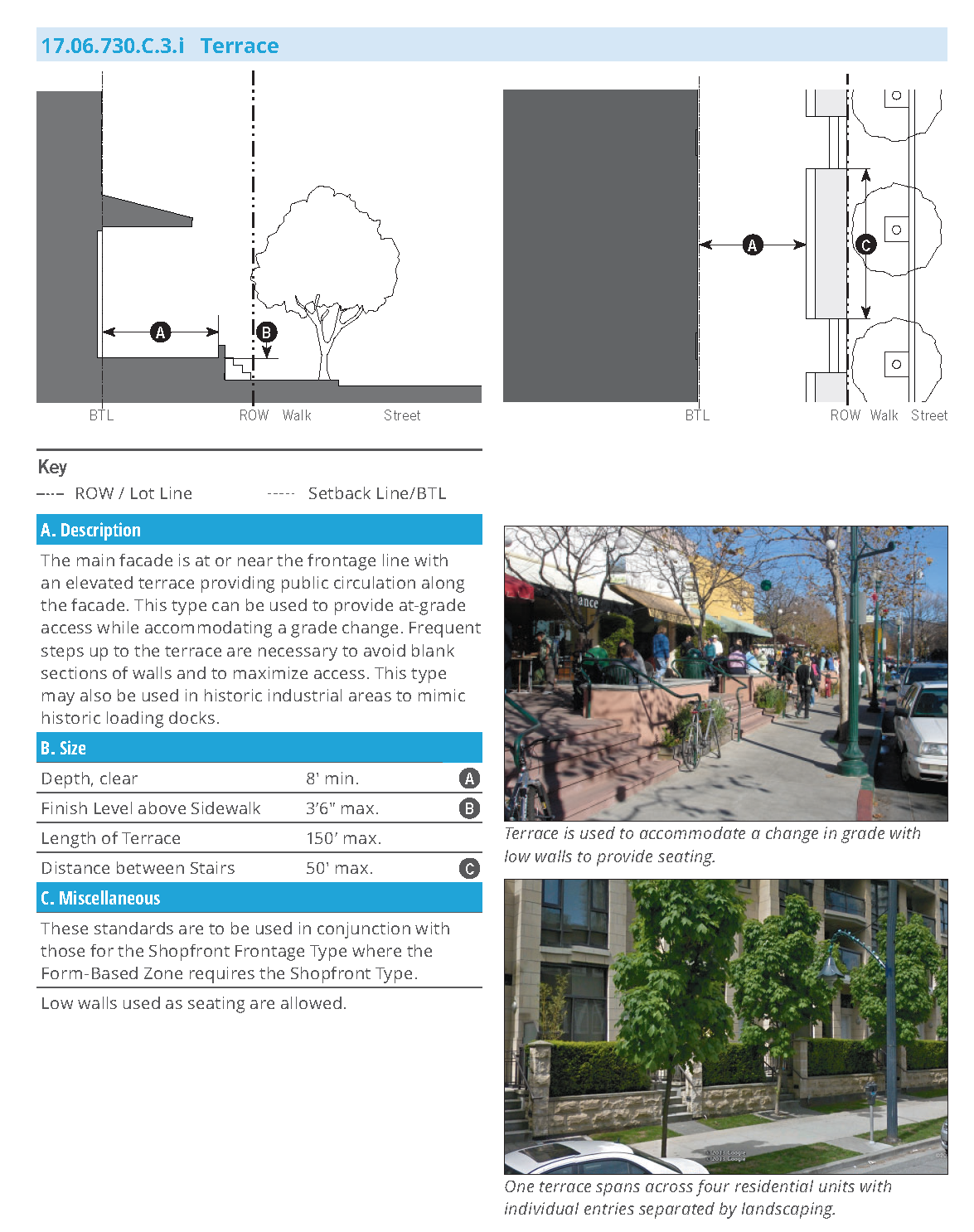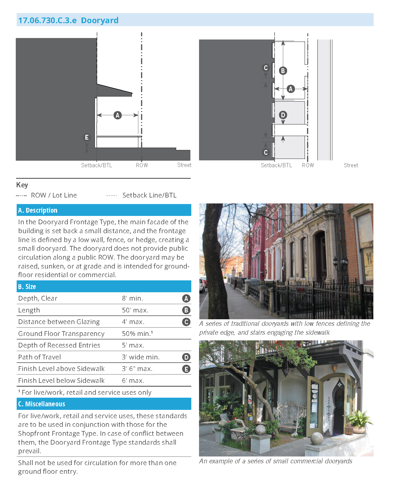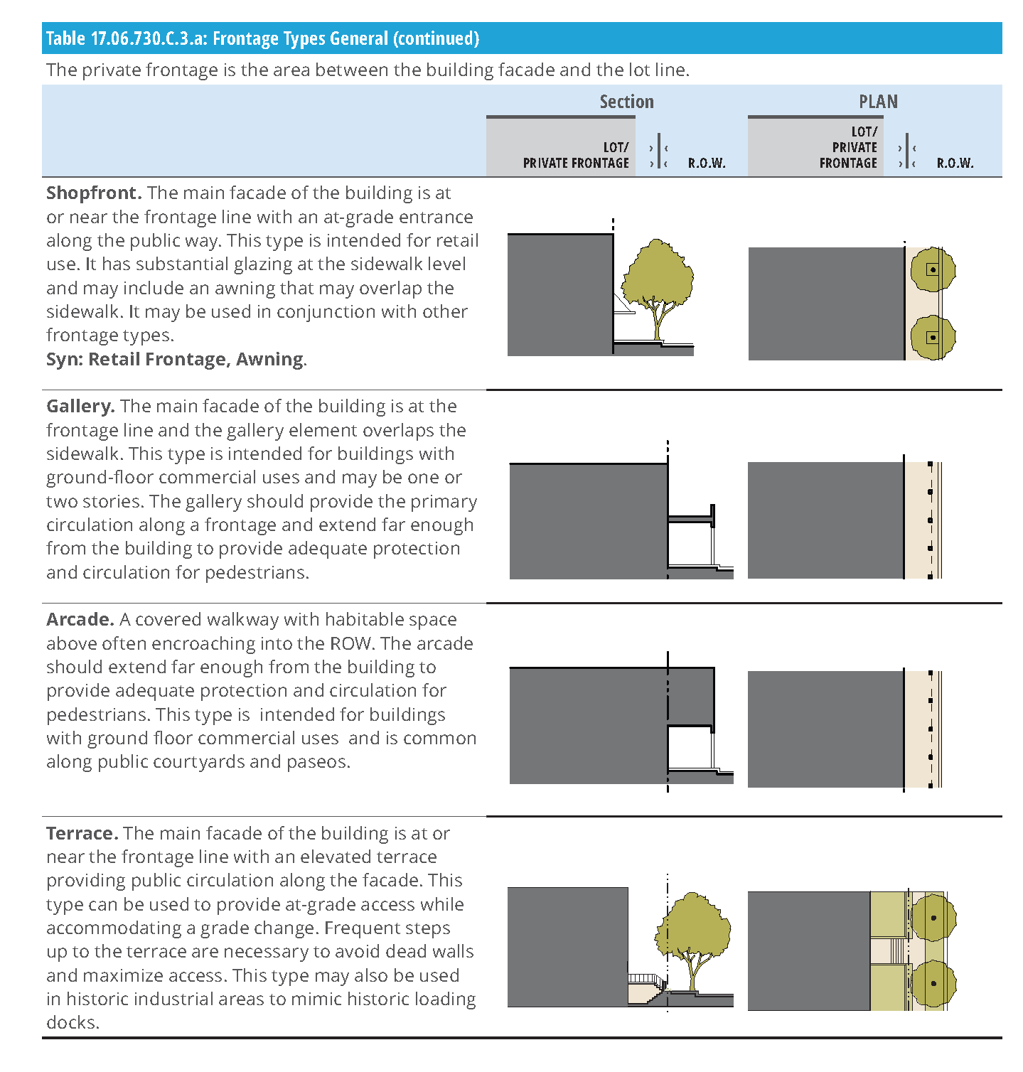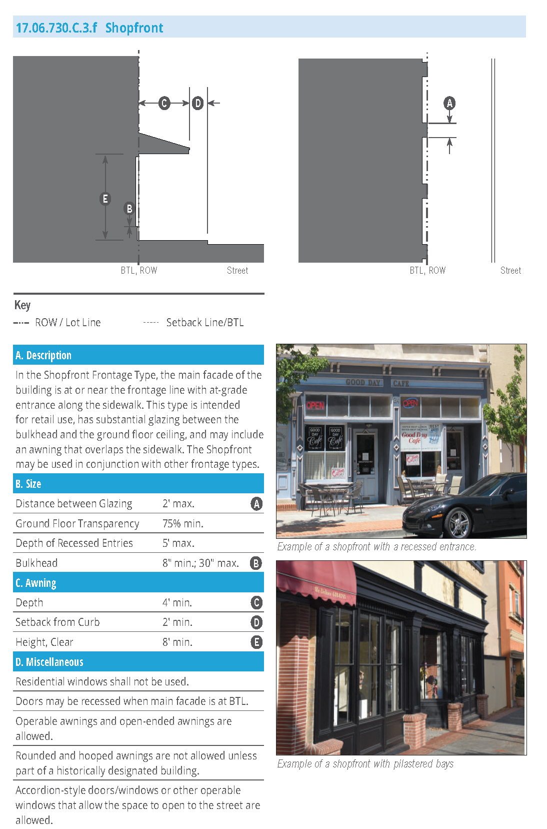 "Storefront/Shopfront." A Private Frontage for Retail use, with no less than seventy percent of the width of the Facade glazed in clear glass, having an awning overhanging the sidewalk, and wherein the Facade is aligned close to the Frontage Line with the building entrance at Sidewalk grade. The first floor shall be confined to Retail use through the first thirty feet in depth.