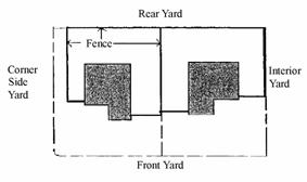 Corner lot fencing. Exterior fences on corner lots may be placed within the required exterior side yard but shall be no less than three feet from the back of the sidewalk and shall be positioned out of the public right-of-way. Where a fire hydrant is present, any fence or wall shall maintain a minimum three foot clearance from said fence or wall. In cases where the fence is to be built in conjunction with a retaining wall, and the wall face is exposed to the street, the fence shall be set back a minimum of three feet from the retaining wall.