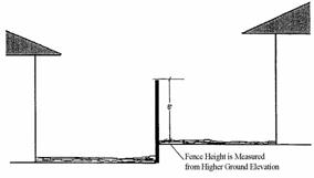 Fence height shall be measured from the grade level of the property line. In the event the ground elevation is not the same on both sides of a fence or wall, the height thereof may be measured from the higher ground elevation.
