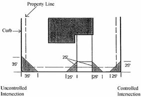 Driveways: A triangle having twenty-five foot tangents at the outside line of the driveway and the curbline.
