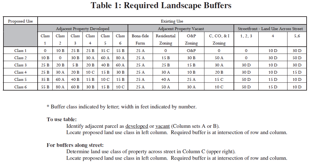 The type of landscape buffer that must be installed is as identified in Table 1, below. Depending on the land use classifications of the proposed use and the uses of the adjacent property(s), Table 1 specifies a landscaped buffer of a particular type and a particular minimum width. Paragraph f., below, identifies the land uses that fall within each land use classification shown in Table 1 and paragraph g. identifies the width and type of vegetation for each type buffer.