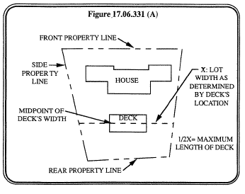 The overall length of the deck shall not exceed fifty percent of the width of the lot. For the purpose of this section, the width of the lot and deck shall be measured as shown below: