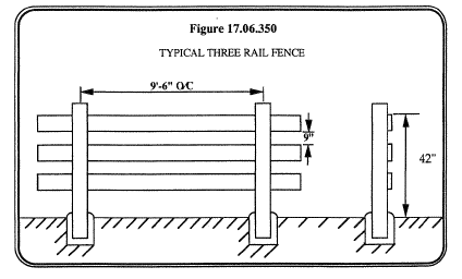 When lots are located in the "H" overlay districts, as described in Chapter 17.36 of this code, a three-rail white fence shall be permitted in the front yard of the lots. The fence shall be forty-two inches in height measured at the top of the rail and shall consist of three white wooden rails which are vertically spaced nine inches apart and which are supported by white wooden posts, horizontally spaced nine feet six inches on center. (See Figure 17.06.350.)
