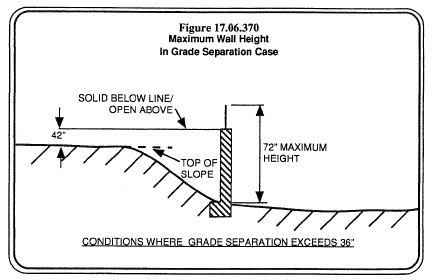 In rear and side setbacks, if there is a grade difference greater than thirty-six inches between two adjoining lots, then no solid fencing or wall shall extend more than forty-two inches above the height of the upper building pad. Any fencing which is over forty-two inches above the height of the building pad shall be open (capable of admitting at least ninety percent light and air). (See Figure 17.06.370.)
