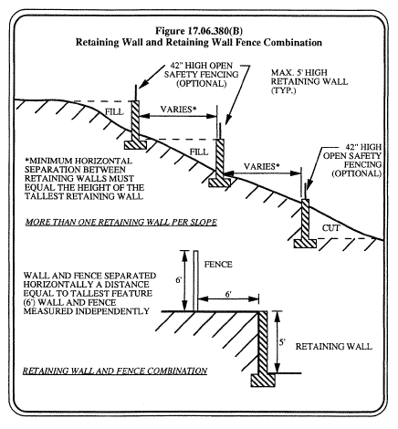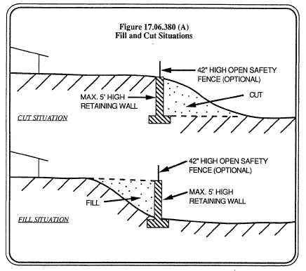 In a cut or fill situation, a maximum forty-two inch open safety fence (capable of admitting at least ninety percent light and air) shall be permitted at the top of the retaining wall. (See Figures 17.06.380(A), fill and cut situations.)