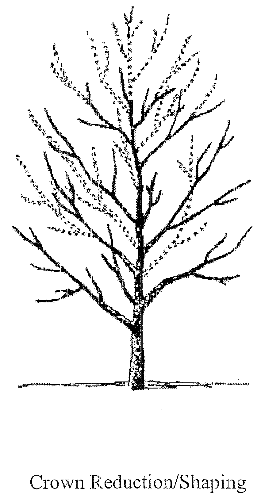 "Crown reduction/shaping" means a method of comprehensive pruning that reduces a tree's height and/or spread. Crown reduction entails the reduction of the top, sides or individual limbs by means of removal of leaders or the longest portion of limbs to a lateral large enough to assume the terminal. The diagram that follows is illustrative of "crown reduction/shaping" within the meaning of this chapter.