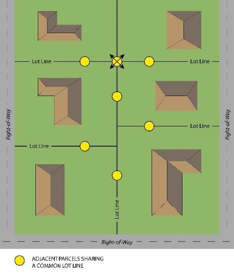 Adjacent: The condition of sharing a common property line.