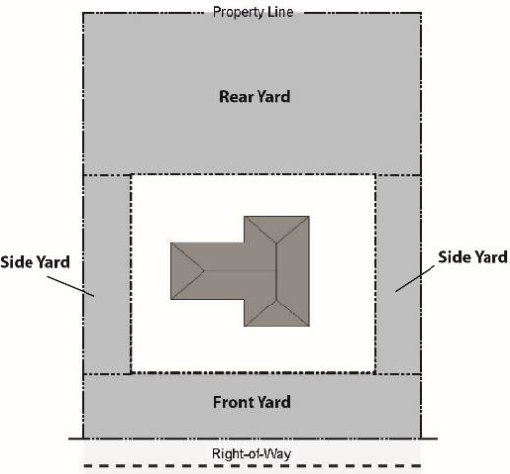 Yard, corner side: On properties abutting two streets, the longer yard abutting one of those streets and located parallel or opposite an interior side yard.