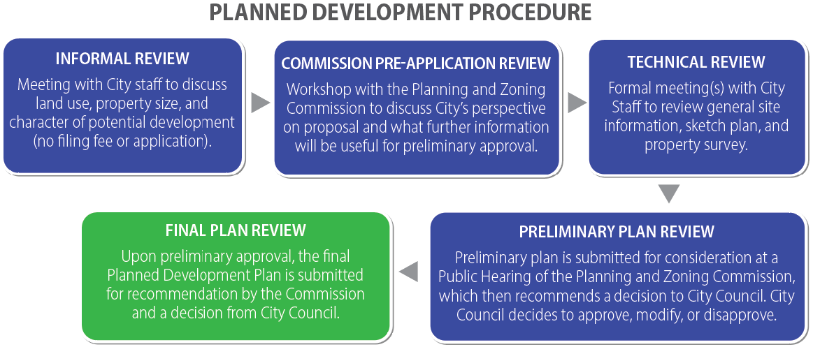 Technical review: A formal meeting to review the proposed planned development shall be held with city staff for preliminary consideration of the proposed development in light of the requirements of this chapter. Materials required prior to scheduling and conducting the technical review, shall be the same as the planning and zoning commission pre-application review, as well as other materials that may be required by the zoning administrator as needed to provide useful background for the review team.