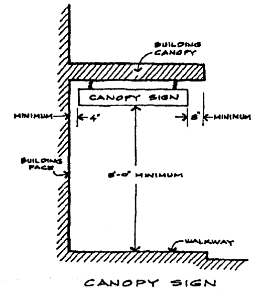 Over Private Property: Projecting, awning, and canopy signs shall provide at least eight feet of clearance above the ground when erected over pedestrian walkways on private property and 17 feet of clearance when erected over driveways or other areas used for vehicles. Suspended canopy signs shall be at least four inches from the building face and at least eight inches from the edge of the canopy.