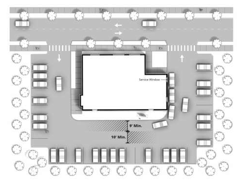 A minimum of nine feet in width, as measured from the outermost point of any service window or bay entrance, to the edge of the driveway, and 18 feet in length. In the case of a recessed service window, the measurement must be taken from the building wall.