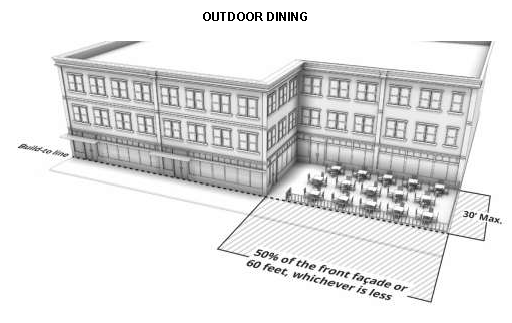 Outdoor dining. A seating area that is located outdoors and contiguous to a restaurant or bar, typically in addition to an indoor seating area. Outdoor dining is approved separately as a principal use. Outdoor dining areas may be roofed or covered with an awning.