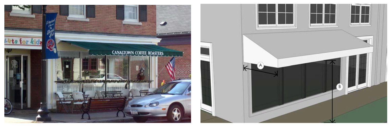 Awnings should be made of a traditional material (canvas-like), design and color. Traditional colors include black, dark green, navy, and maroon.