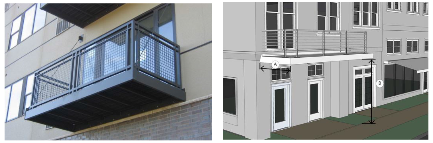 Description. A balcony is an exterior platform that projects from or into the façade of a building and is surrounded by a railing, handrail, or parapet.