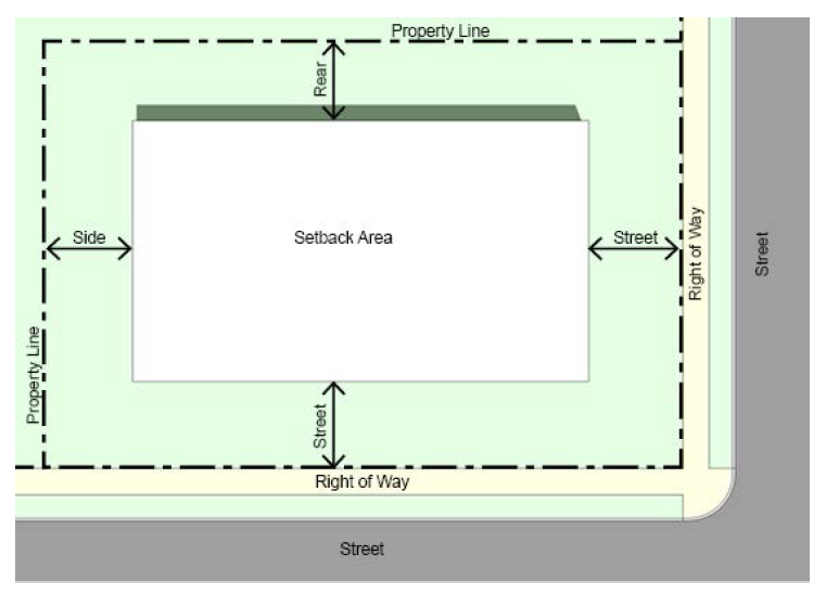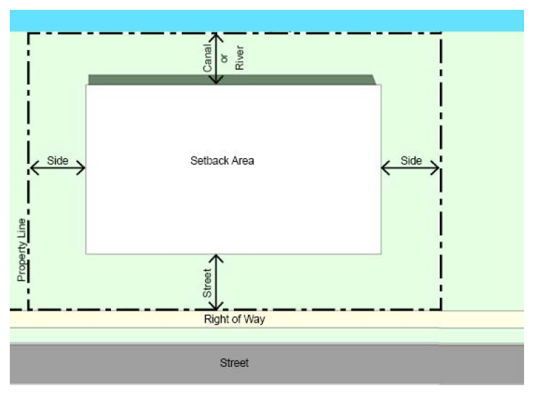 Building setbacks. Building setbacks apply to all structures. There are five types of setbacks and they are measured from the property line: