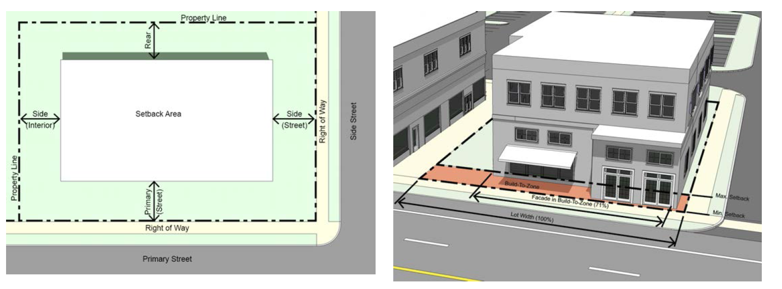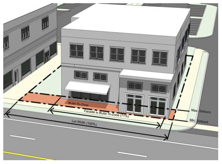 Build-to zone. One of the most important defining elements of the public realm is the street wall. The street wall is made up of building facades that are placed within the build-to zone to create a continuous building fabric. The build-to-zone is the area between the minimum and maximum front setbacks. Portions of a building must be placed within this zone along a prescribed percentage of the lot width.